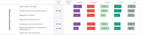 Nhóm ngành Kỹ thuật Điện – Điện tử được xếp hạng tốp 401-450 thế giới; nhóm ngành Kỹ thuật cơ khí, Hàng không và Chế tạo đứng trong nhóm 451-500; và nhóm ngành Khoa học máy tính và Hệ thống thông tin (Công nghệ thông tin) thuộc nhóm 501-550.