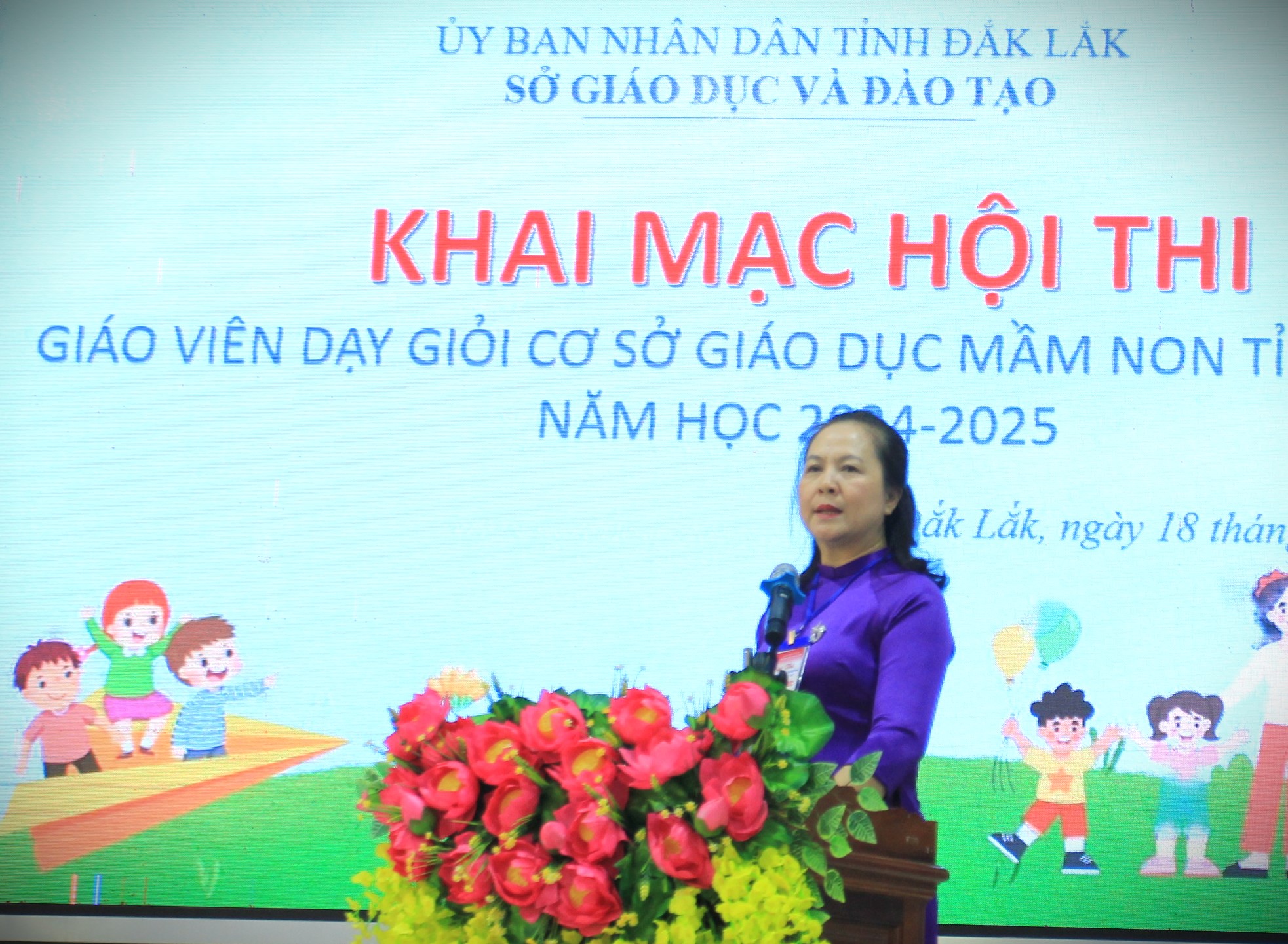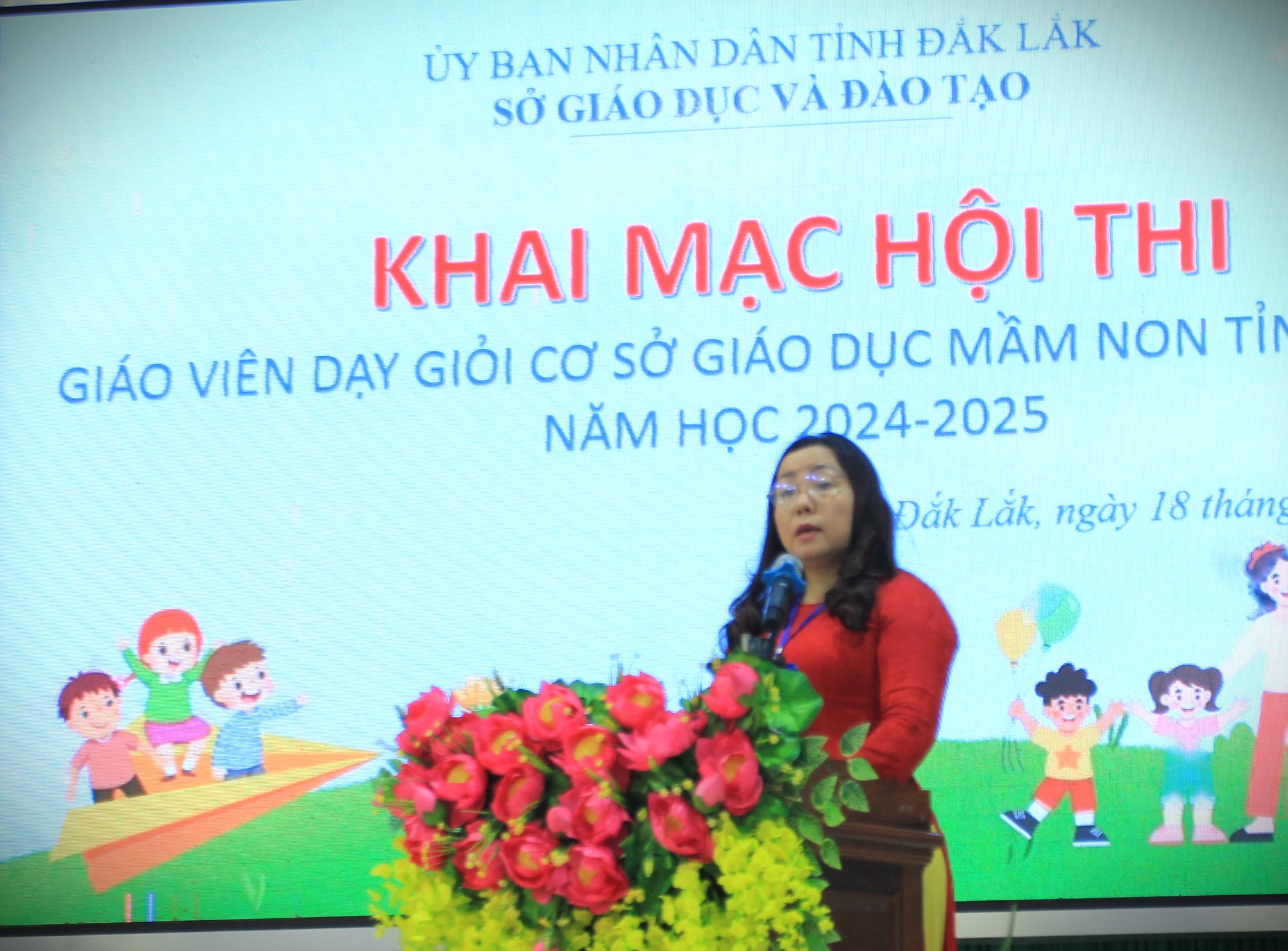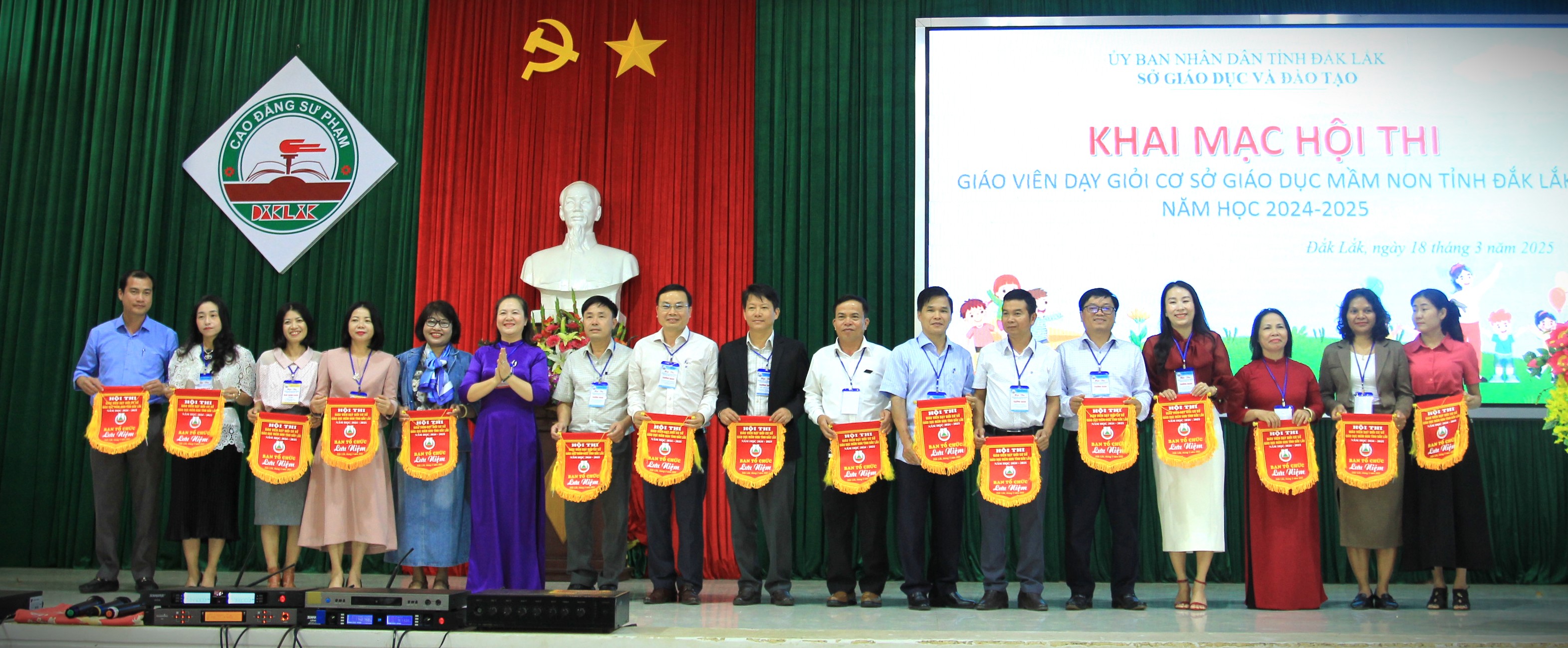 Sáng 18/3, tại Trường Cao đẳng Sư phạm Đắk Lắk, Sở Giáo dục và Đào tạo (GDĐT) tổ chức khai mạc Hội thi giáo viên dạy giỏi cơ sở giáo dục mầm non (GDMN) tỉnh Đắk Lắk, năm học 2024 - 2025. Tham dự lễ khai mạc có bà Lê Thị Kim Oanh – Phó Giám đốc Sở GDĐT, Phó Trưởng Ban tổ chức hội thi; đại diện lãnh đạo các phòng chuyên môn, nghiệp vụ Sở GDĐT; đại diện lãnh đạo phòng GDĐT các huyện, thị xã, thành phố; cán bộ quản lý, các thí sinh (TS) là giáo viên đến từ các cơ sở GDMN trên địa bàn tỉnh tham gia dự thi.