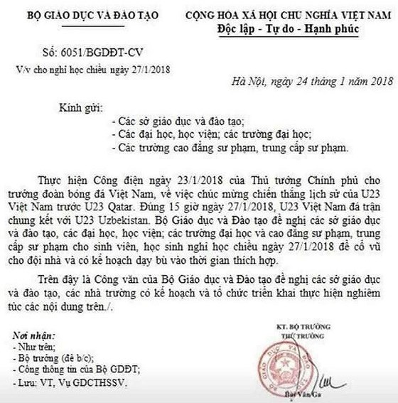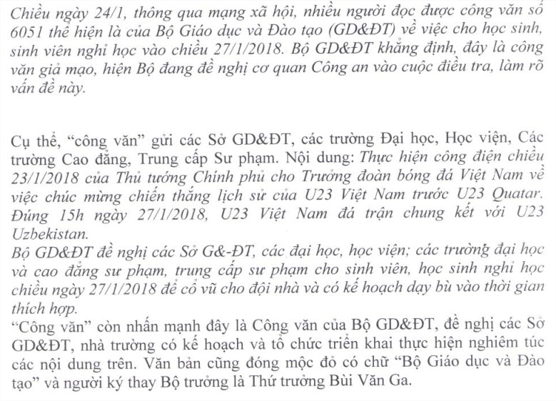 Bộ GDĐT cảnh báo về việc giả mạo công văn của Bộ cho học sinh nghỉ học chiều ngày 27/01/2017