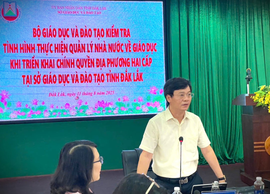 Trong hai ngày 11, 12/8/2025, Đoàn công tác của Bộ GDĐT do ông Phạm Tuấn Anh – Phó Cục trưởng, Cục Nhà giáo và Cán bộ Quản lý giáo dục, Bộ GDĐT làm trưởng đoàn đã làm việc với Sở GDĐT Đắk Lắk và một số địa phương trên địa bàn tỉnh về tình hình thực hiện quản lý nhà nước về giáo dục khi triển khai chính quyền địa phương hai cấp.