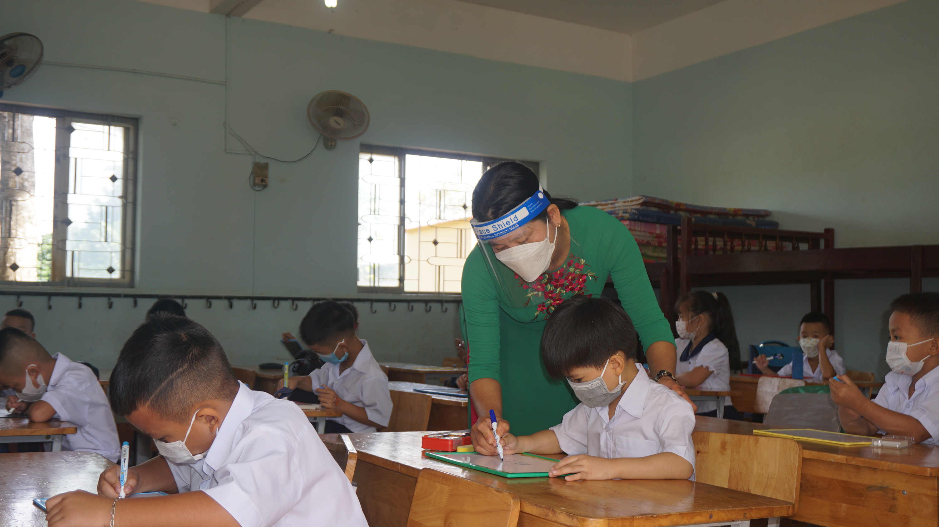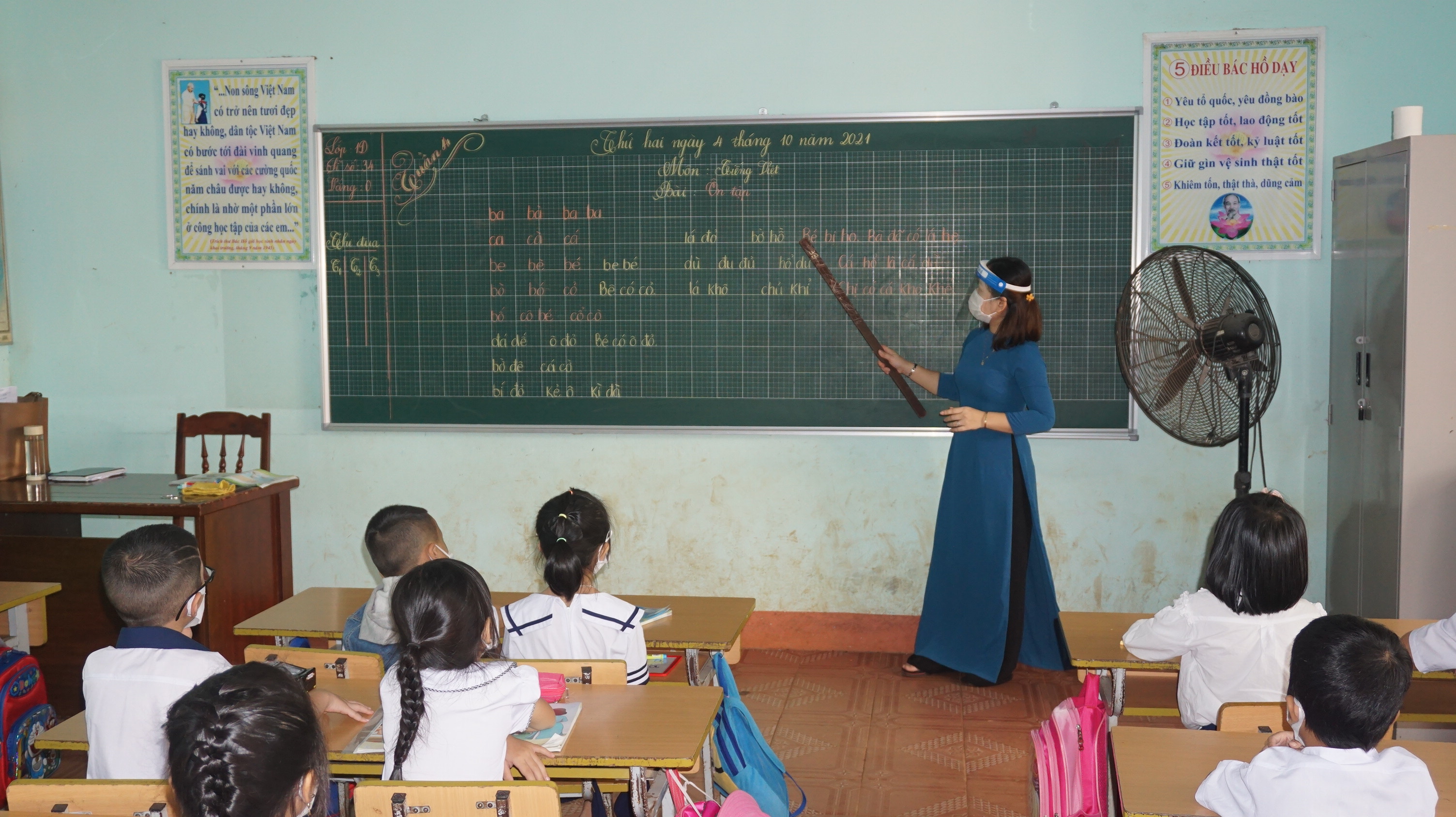 Cô, trò trường Tiểu học Nguyễn Văn Bé, huyện Krông Pắc trong buổi học trực tiếp đầu tiên của năm học 2021 - 2022