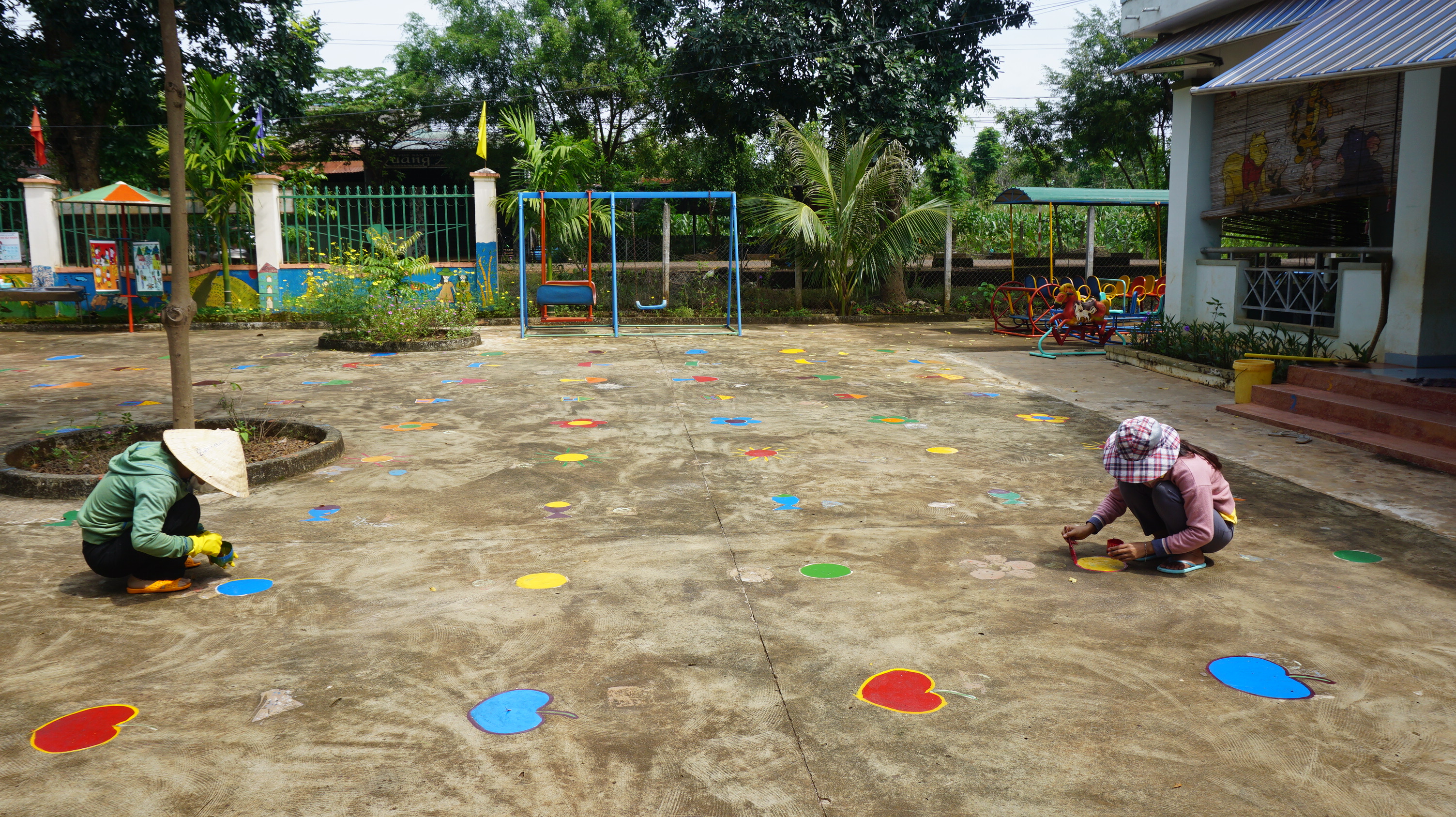 Các cô giáo Trường Mẫu giáo xã Cư M'gar đội nắng, miệt mài vẽ những hình ảnh trên sân trường, làm vị trí đứng khi các em học sinh tham gia hoạt động giáo dục ngoài trời, đảm bảo giữ khoảng cách, an toàn cho các em