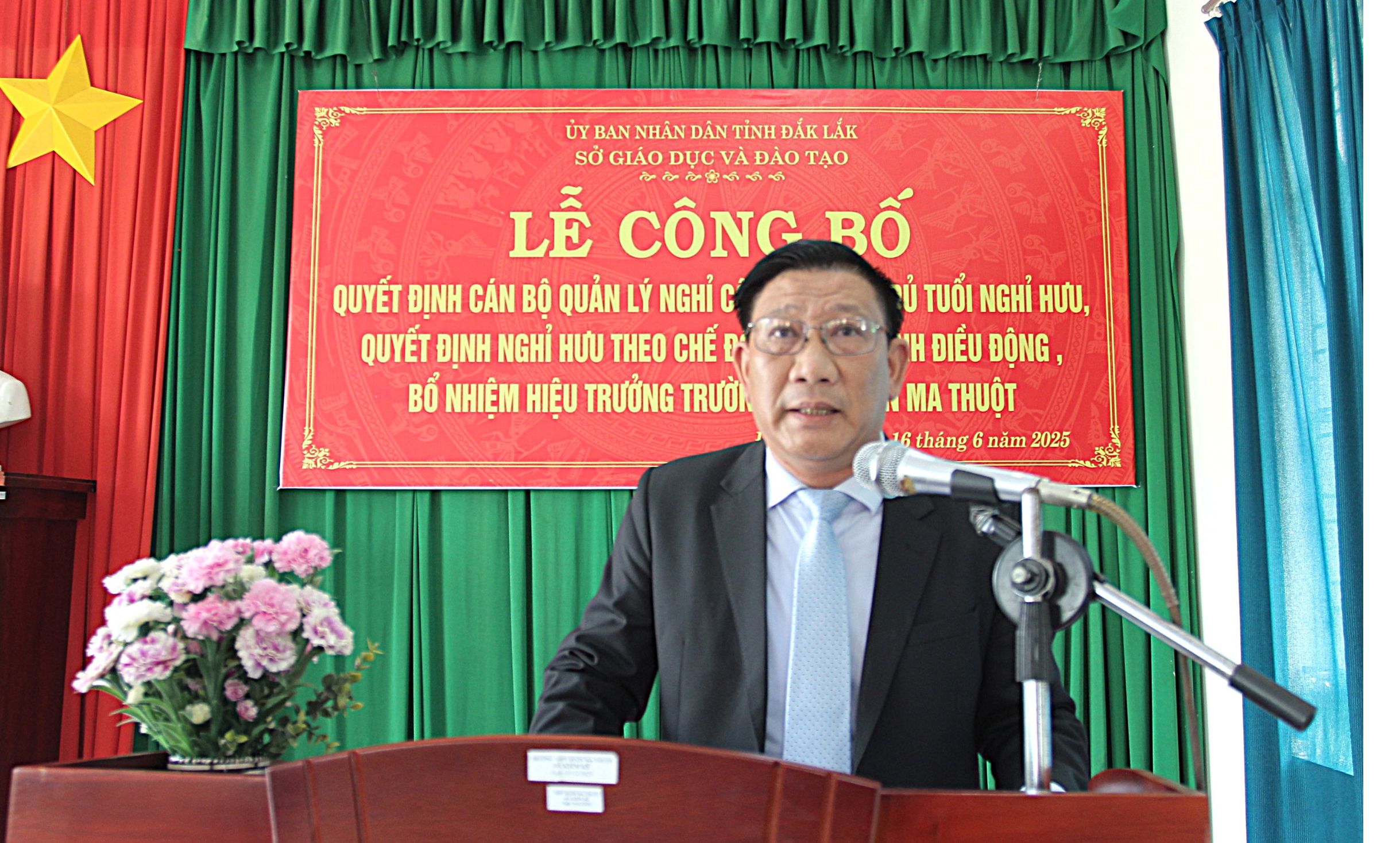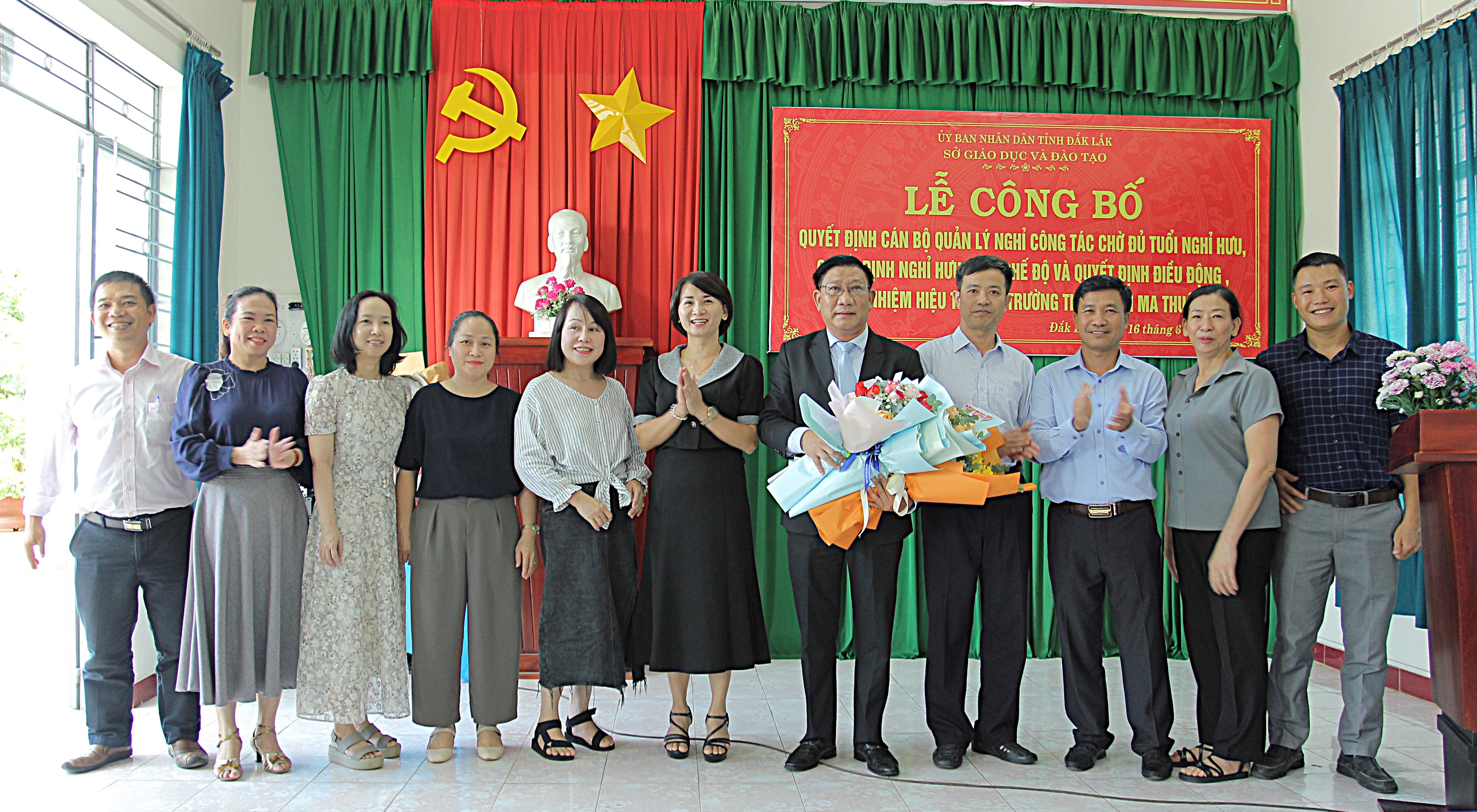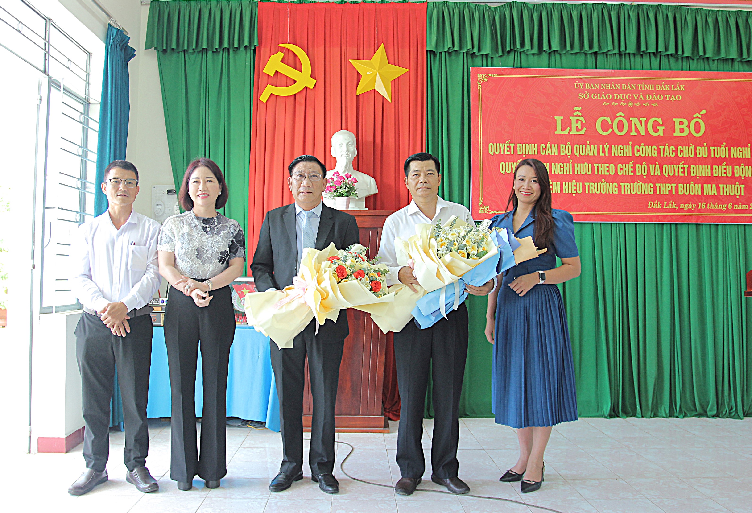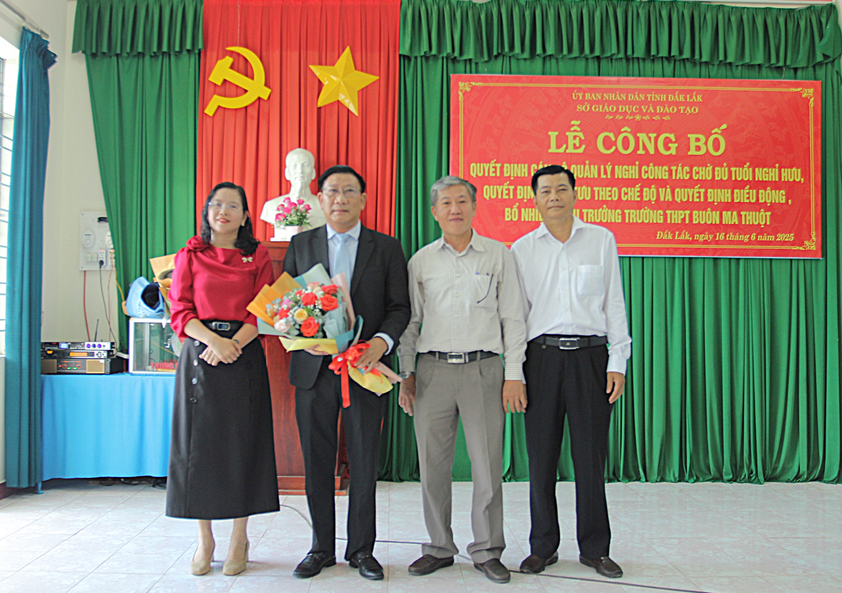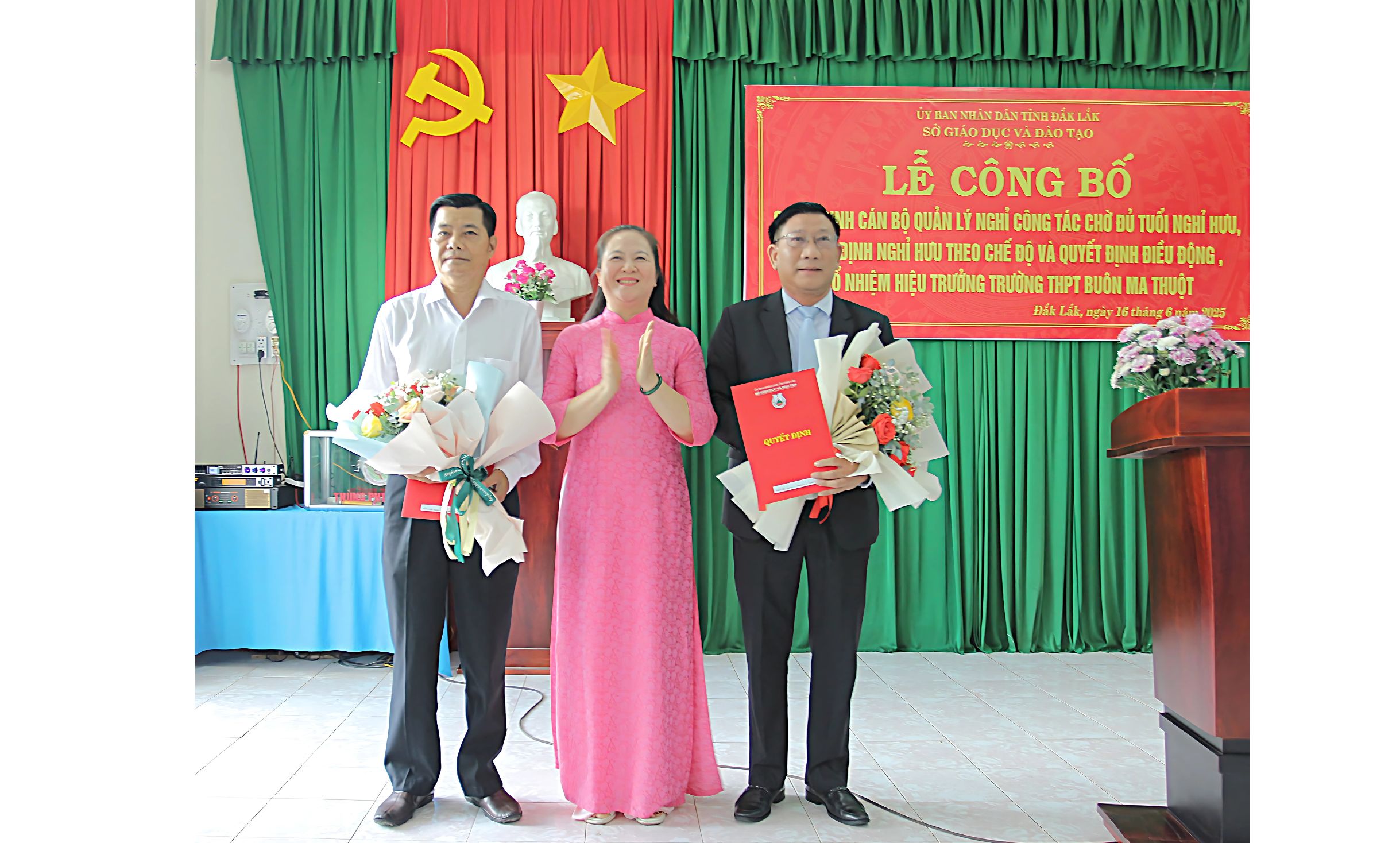 Tại trường THPT Buôn Ma Thuột, Sở GDĐT công bố Quyết định nghỉ công tác chờ đủ tuổi nghỉ hưu và Quyết định về việc viên chức nghỉ hưu hưởng chế độ bảo hiểm xã hội đối với ông Lê Văn Thái, Hiệu trưởng Trường THPT Buôn Ma Thuột; Quyết định điều động bổ nhiệm ông Lê Văn Trị, Hiệu trưởng Trường THPT Lắk giữ chức vụ Hiệu trưởng Trường THPT Buôn Ma Thuột, thời hạn 5 năm, từ ngày 16/6/2025.