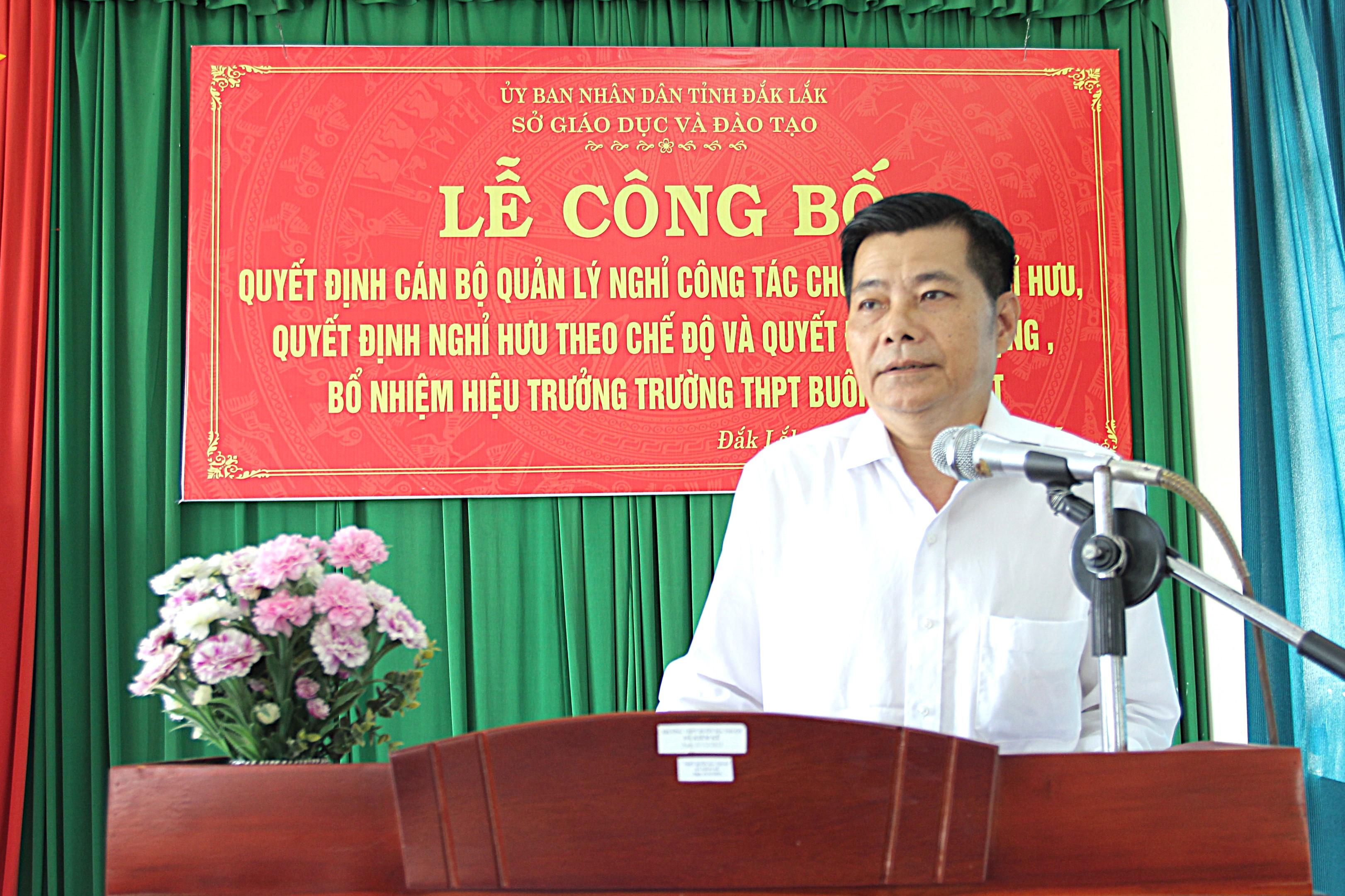 Phát biểu tại buổi Lễ, bà Lê Thị Kim Oanh, Phó Giám đốc Sở GDĐT chúc mừng ông Lê Văn Thái hoàn thành nhiệm vụ, nghỉ hưu hưởng chế độ bảo hiểm xã hội và ông Lê Văn Trị được bổ nhiệm làm Hiệu trưởng Trường THPT Buôn Ma Thuột. Ghi nhận những thành tích, đóng góp của các cán bộ quản lý trong nhiều năm công tác, Phó Giám đốc Sở GDĐT bày tỏ mong muốn ông Lê Văn Thái sau khi nghỉ hưu, tiếp tục đóng góp trí tuệ, kinh nghiệm vì sự phát triển giáo dục tại địa phương; ông Lê Văn Trị tiếp nhận nhiệm vụ, khẩn trương xây dựng, hoàn thiện kế hoạch, định hướng để thực hiện các nhiệm vụ do lãnh đạo sở giao và điều hành mọi hoạt động của Trường THPT Buôn Ma Thuột, nâng cao chất lượng và phát triển vững mạnh. Bà mong rằng dù bất kỳ trong hoàn cảnh, điều kiện nào, tập thể lãnh đạo, giáo viên, nhân viên trường THPT Buôn Ma Thuột sẽ đoàn kết, đồng lòng để phát huy truyền thống ngôi trường qua 70 năm hình thành, xây dựng và phát triển với nhiều thành tích, kết quả đáng tự hào.