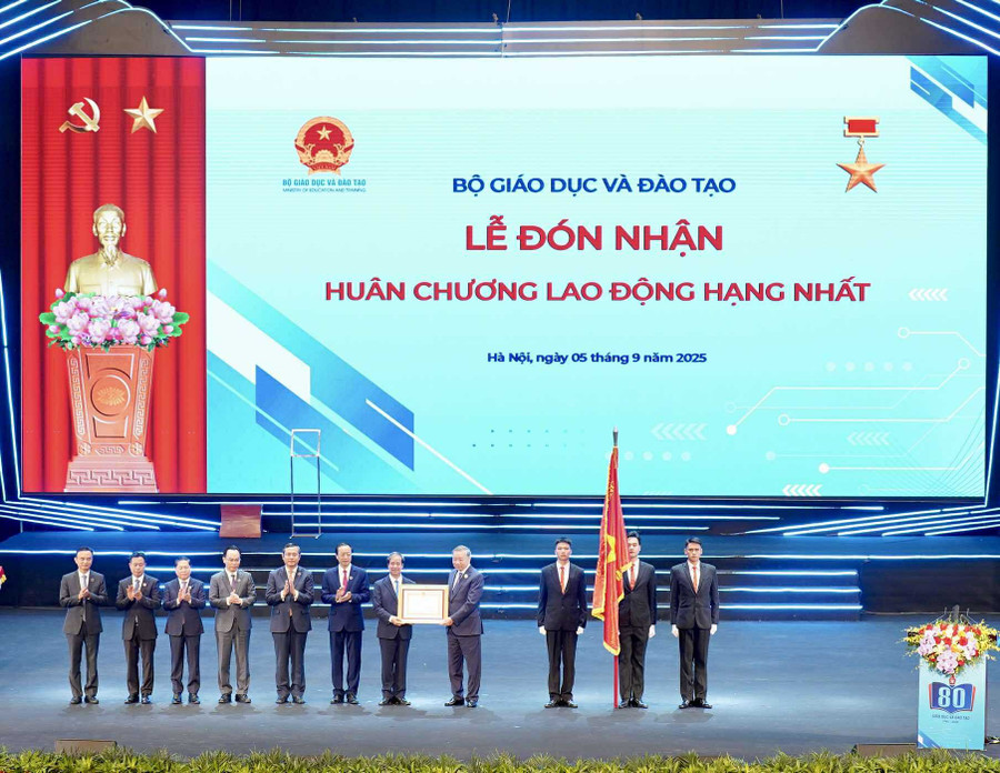 Tại buổi lễ, ngành Giáo dục vinh dự được đồng chí Tổng Bí thư Tô Lâm dự, phát biểu chúc mừng những thành tựu mà ngành Giáo dục đóng góp cho sự phát triển của đất nước trong suốt 80 năm qua, đánh trống khai giảng năm học mới 2025 - 2026. Đồng thời, đồng chí Tổng Bí thư trao tặng Huân chương Lao động hạng Nhất cho Bộ GDĐT.