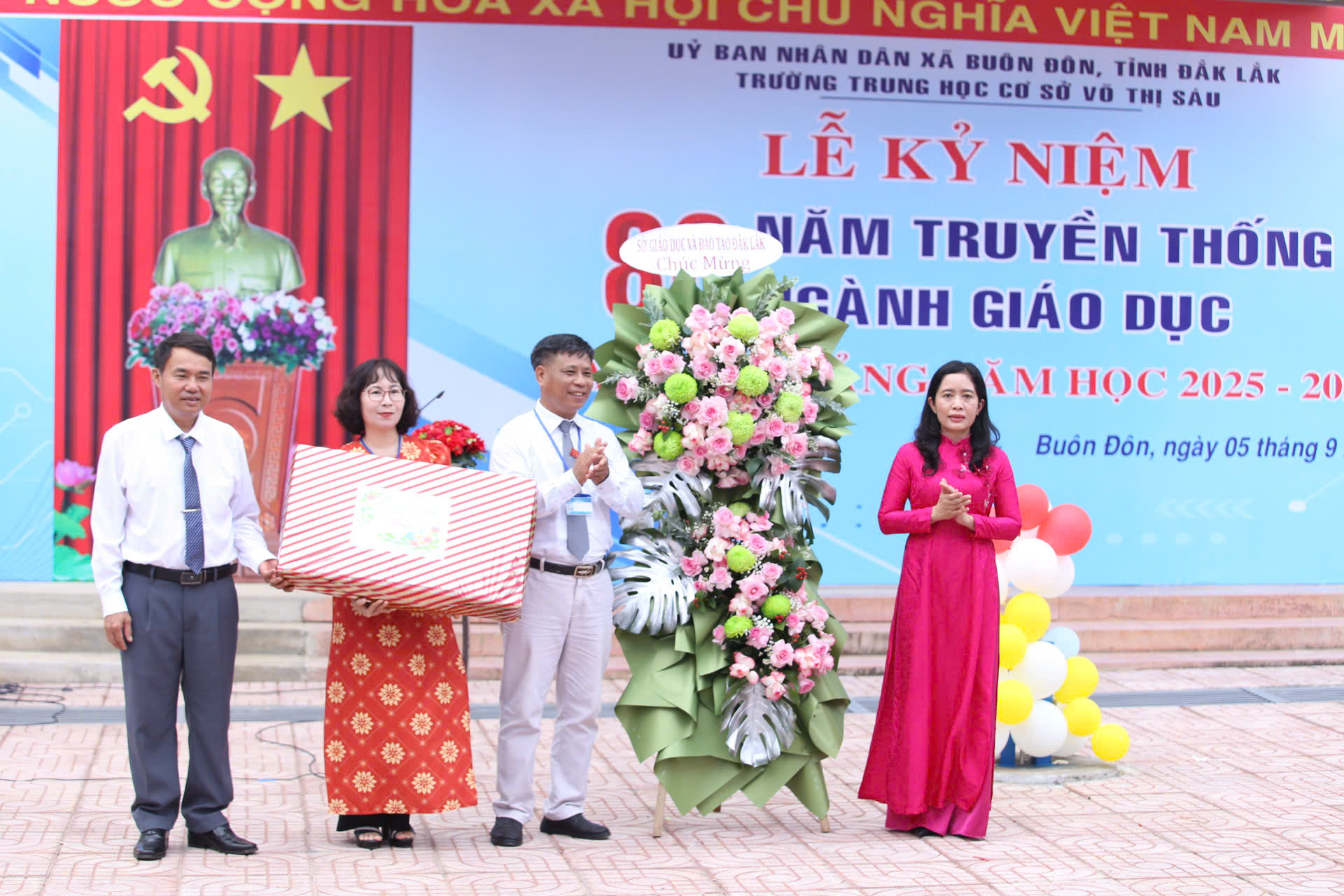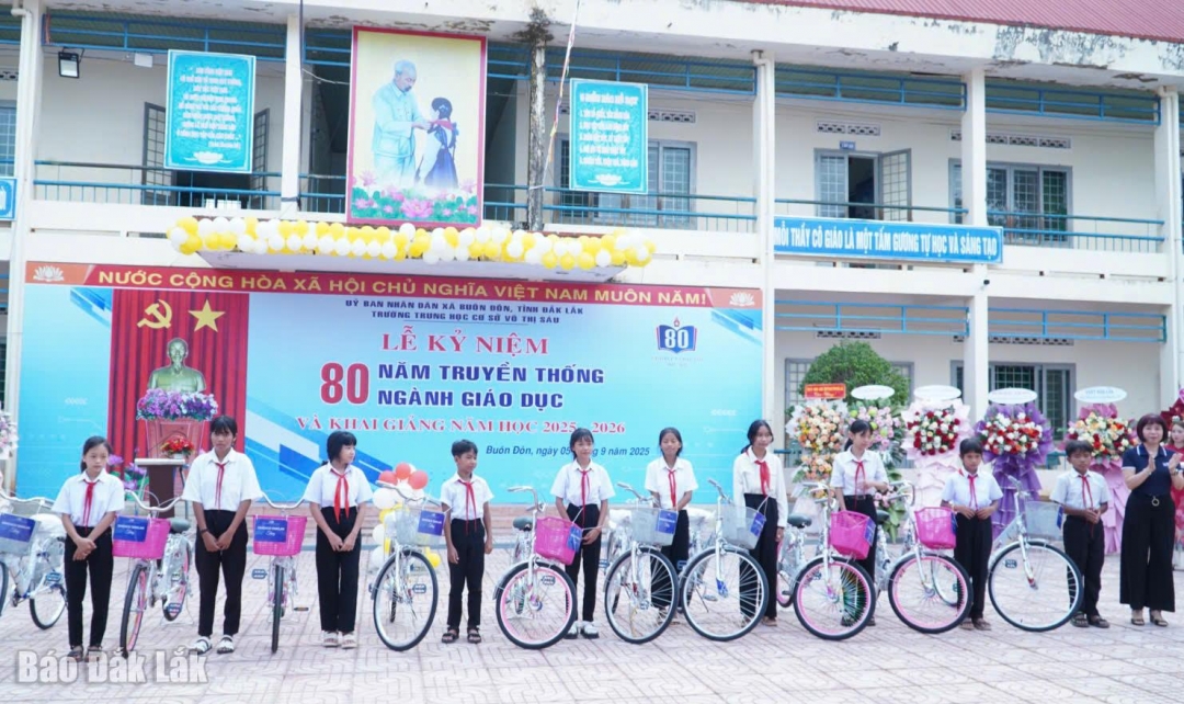 Tại tỉnh Đắk Lắk, hoà chung không khí của Ngày hội toàn dân đưa trẻ đến trường, hơn 1.300 cơ sở giáo dục đồng loạt tổ chức Lễ kỷ niệm 80 năm truyền thống ngành Giáo dục và khai giảng năm học 2025 – 2026. Tham dự tại điểm cầu Trường THCS Võ Thị Sáu, xã Buôn Đôn, tỉnh Đắk Lắk có đồng chí Nguyễn Đình Trung – Ủy viên Ban Chấp hành Trung ương Đảng, Bí thư Tỉnh uỷ; đồng chí Lê Thị Thanh Xuân – Tỉnh uỷ viên, Giám đốc Sở GDĐT; lãnh đạo các phòng chuyên môn nghiệp vụ thuộc Sở GDĐT; lãnh đạo chính quyền, đoàn thể xã Buôn Đôn; cán bộ, giáo viên, nhân viên, học sinh, phụ huynh học sinh trường THCS Võ Thị Sáu.