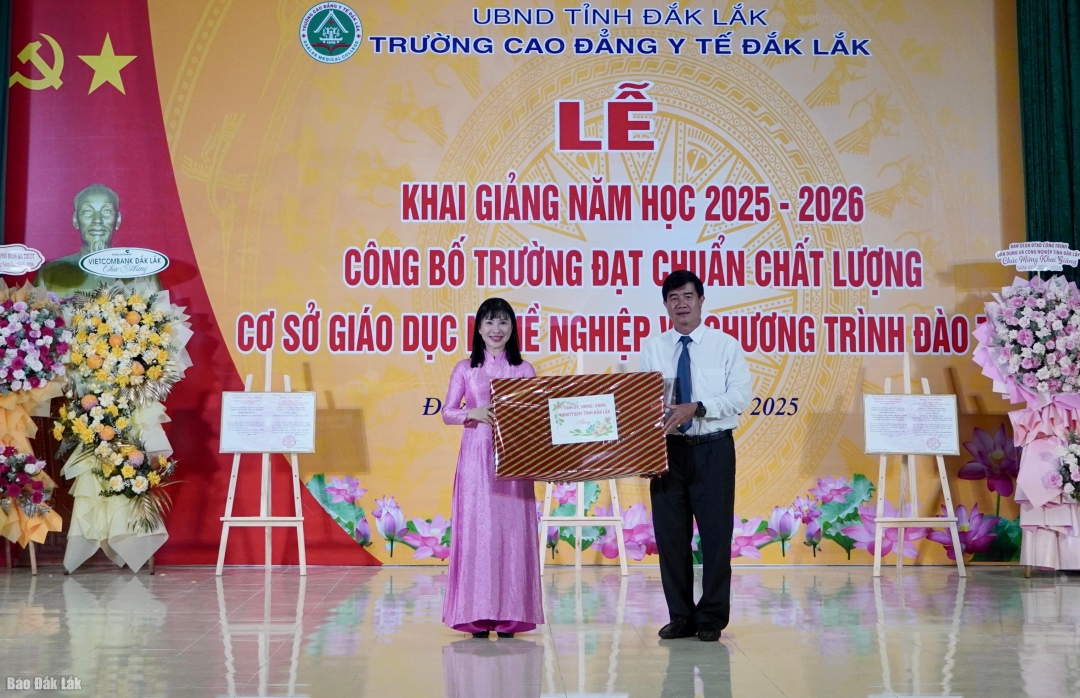 Phó Chủ tịch UBND tỉnh Nguyễn Thiên Văn tặng quà chúc mừng Trường Cao đẳng Y tế Đắk Lắk nhân dịp năm học mới.
