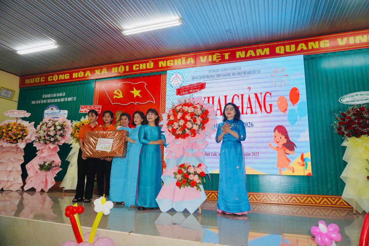 Phó Trưởng đoàn chuyên trách, phụ trách Đoàn ĐBQH tỉnh Nguyễn Thị Thu Nguyệt tặng hoa, quà chúc mừng Trung tâm Hỗ trợ phát triển, giáo dục hoà nhập trẻ khuyết tật