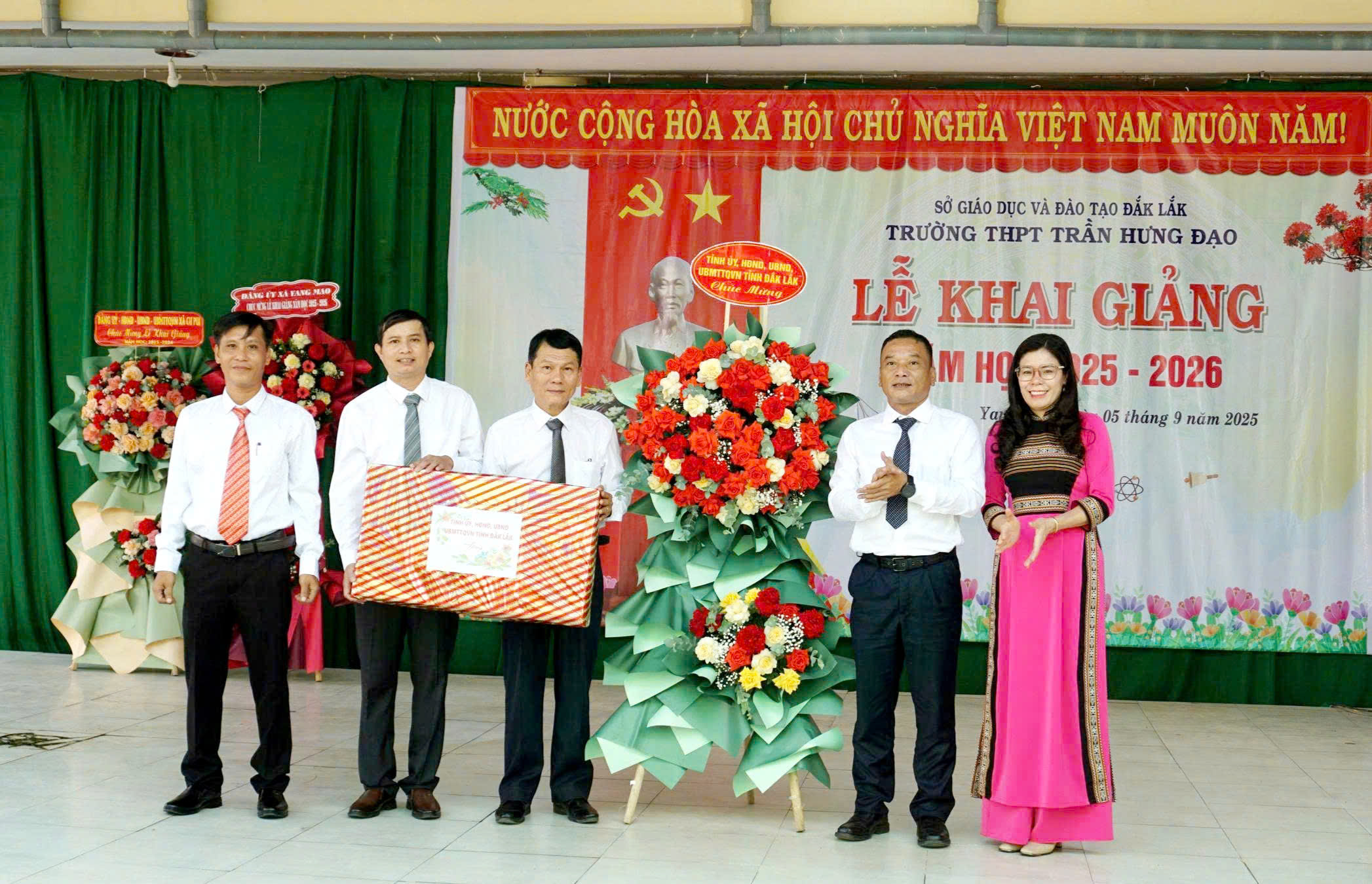 Chủ tịch Ủy ban MTTQ Việt Nam tỉnh Y Giang Gry Niê Knơng tặng hoa, quà chúc mừng thầy và trò trường THPT Trần Hưng Đạo