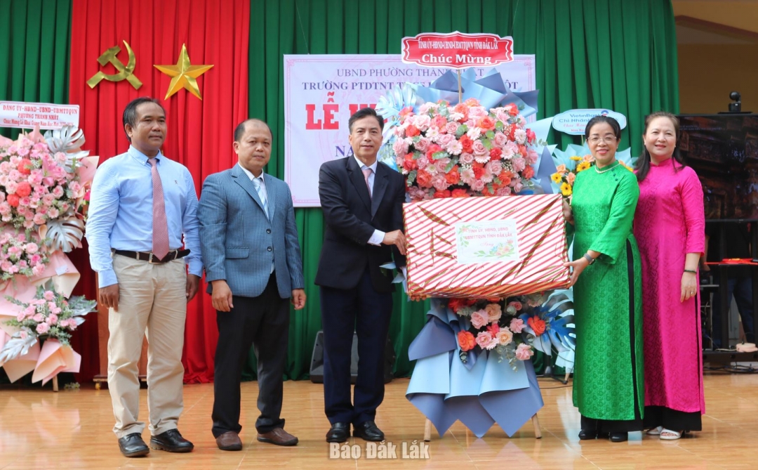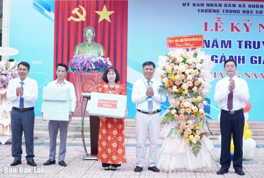Phó Bí thư Tỉnh ủy Huỳnh Thị Chiến Hòa và Phó Giám đốc Sở GDĐT Lê Thị Kim Oanh tặng hoa, quà chúc mừng thầy và trò Trường phổ thông Dân tộc nội trú THCS Buôn Ma Thuột (ảnh: Báo Đắk Lắk).