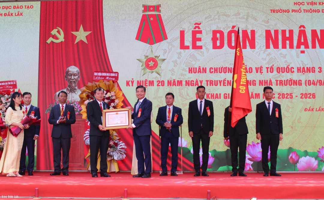 Phó Bí thư Tỉnh ủy, Chủ tịch UBND tỉnh Tạ Anh Tuấn trao Huân chương Bảo vệ Tổ quốc hạng Ba của Chủ tịch nước cho Trường Phổ thông DTNT Tây Nguyên (ảnh: Báo Đắk Lắk).