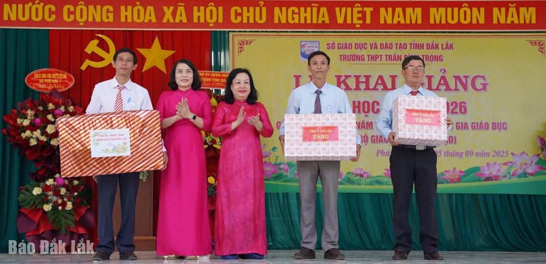 Đồng chí Cao Thị Hòa An, Phó Bí thư Thường trực Tỉnh ủy, Chủ tịch HĐND tỉnh và Phó Giám đốc Sở GDĐT Võ Thị Minh Duyên tặng quà, chúc mừng thầy và trò trường THPT Trần Bình Trọng (ảnh: Báo Đắk Lắk).