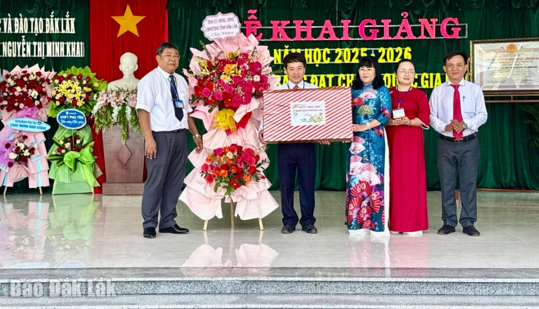 Phó Chủ tịch Thường trực UBND tỉnh Hồ Thị Nguyên Thảo và Phó Giám đốc Sở GDĐT Nguyễn Huy Văn tặng hoa, quà chúc mừng thầy và trò trường THPT Nguyễn Thị Minh Khai (ảnh: Báo Đắk Lắk).