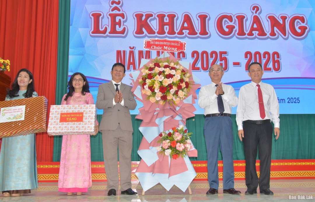 Phó Chủ tịch UBND tỉnh Trương Công Thái và Phó Giám đốc Sở GDĐT Đỗ Tường Hiệp tặng hoa, quà chúc mừng thầy và trò trường THPT chuyên Nguyễn Du (ảnh: Báo Đắk Lắk).