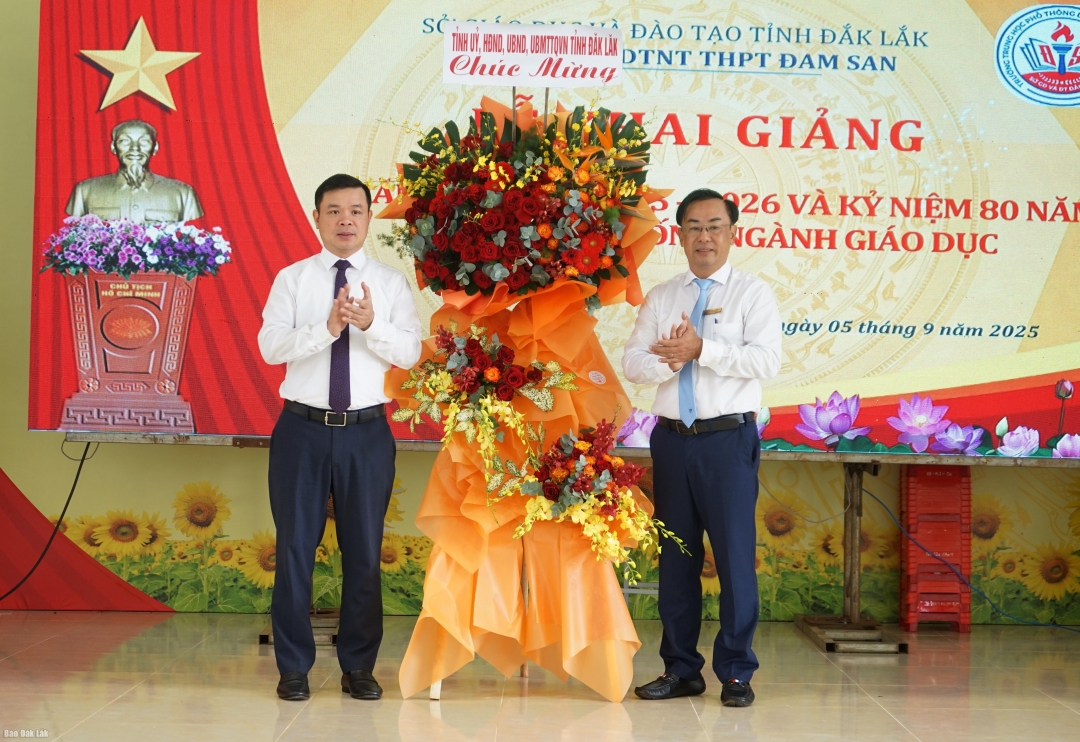 Phó Bí thư Tỉnh ủy Đỗ Hữu Huy tặng hoa chúc mừng thầy và trò trường THPT DTNT Đam San (ảnh: Báo Đắk Lắk)
