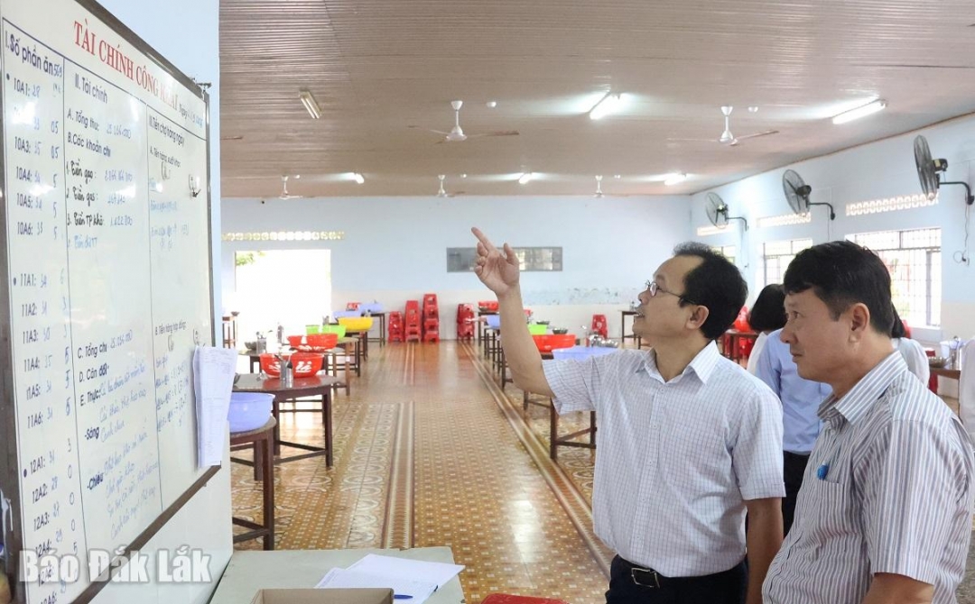 Đoàn khảo sát kiểm tra thực đơn tại bếp ăn của trường (ảnh: Báo Đắk Lắk).