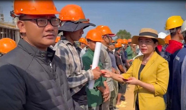 Giám đốc Sở GDĐT Lê Thị Thanh Xuân trao quà và gửi lời chúc mừng năm mới tới cán bộ, kỹ sư, công nhân đang trực tiếp thi công các công trình (Ảnh: Báo Đắk Lắk)