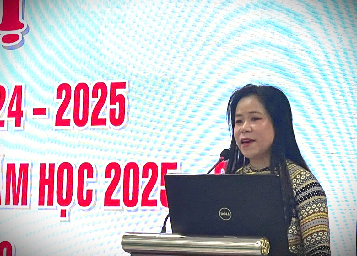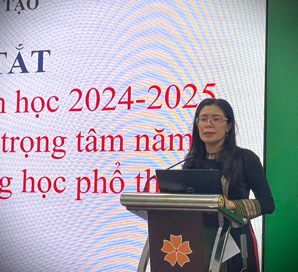 Bà Lê Thị Thảo - Trưởng phòng GDPT báo cáo kết quả năm học 2024-2025 cấp THPT