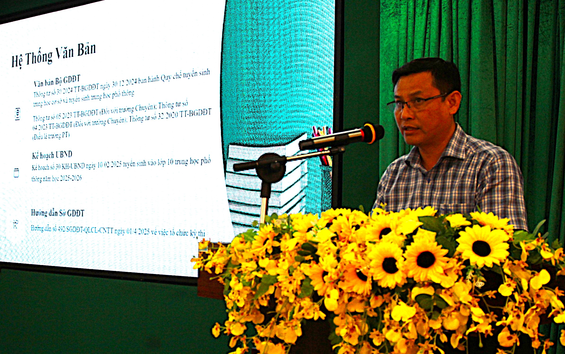Về tuyển sinh lớp 10 năm học 2025 - 2026, Giám đốc Sở yêu cầu các cơ quan, đơn vị thực hiện đúng Thông tư số 30/2024/TT-BGDĐT ngày 30/12/2024 ban hành quy chế tuyển sinh trung học cơ sở và tuyển sinh trung học phổ thông; làm tốt công tác tuyên truyền về tuyển sinh đến học sinh, phụ huynh và toàn xã hội; chủ động nghiên cứu, xây dựng phương án tổ chức thi thử cho học sinh đảm bảo hiệu quả, thiết thực; chú ý công tác ôn tập, bám sát cấu trúc đề minh họa, cá thể hóa học sinh để đảm bảo ôn tập hiệu quả; bên cạnh đó phải tổ chức dạy thật tốt chương trình chính khóa và thực hiện ôn tập theo đúng 3 nhóm đối tượng tại Thông tư số 29/2024/TT-BGDĐT về quản lý dạy thêm, học thêm. Đồng thời, Giám đốc kêu gọi mỗi giáo viên, cán bộ quản lý giáo dục xác định rõ trách nhiệm, nâng cao tinh thần nhiệt huyết, lòng tự trọng khi thực hiện nhiệm vụ; kiên trì, quyết tâm hoàn thành các nhiệm vụ năm học.