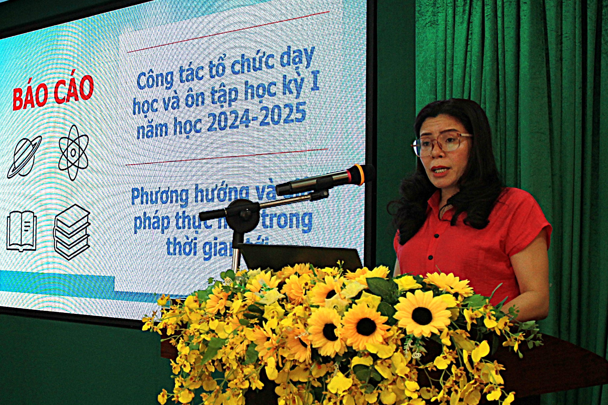 bà Lê Thị Thảo trưởng phòng GDPTNNTX báo cáo đánh giá chất lượng, hiệu quả công tác dạy học và ôn thi cho học sinh lớp 9 và triển khai nhiệm vụ trong thời gian tiếp theo