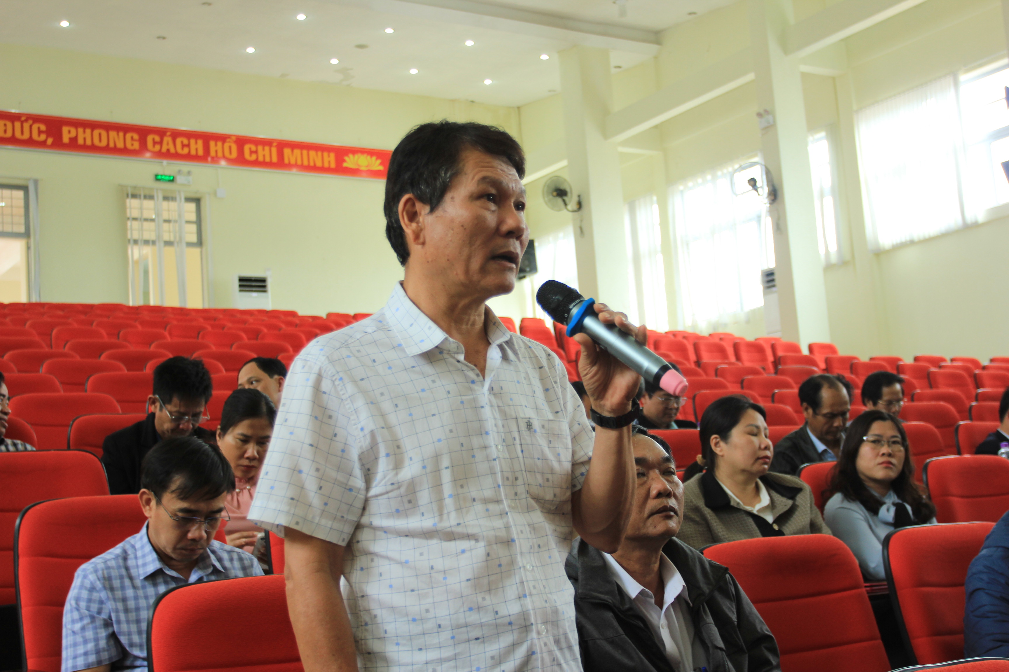 Hiệu trưởng Trường THPT Trần Hưng Đạo Mai Văn Thanh tham gia ý kiến tại Hội nghị