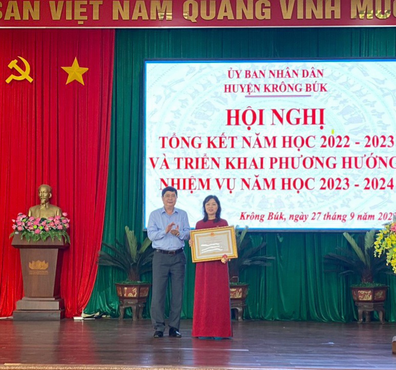 Sáng ngày 27/9, UBND huyện Krông Búk tổ chức Hội nghị tổng kết năm học 2022 - 2023, triển khai nhiệm vụ năm học 2023 - 2024. Tham dự Hội nghị có ông Phạm Đăng Khoa - Tỉnh ủy viên, Giám đốc Sở Giáo dục và Đào tạo (GD&ĐT); ông Nguyễn Quang Hùng- Phó Bí thư Thường trực Huyện ủy; ông Hoàng Kiên Cường - Phó Bí thư Huyện ủy, Chủ tịch UBND huyện; ông Trần Quốc Tuấn - Ủy viên Ban Thường vụ Huyện ủy, Chủ tịch HĐND huyện; ông Y Ni MLô - Phó Chủ tịch UBND huyện; ông Nguyễn Đình Khả - Huyện ủy viên, Trưởng phòng GD&ĐT huyện; đại diện lãnh đạo các phòng chuyên môn, nghiệp vụ Sở GD&ĐT; đại diện lãnh đạo các phòng, ban chuyên môn thuộc huyện; lãnh đạo, chuyên viên phòng GD&ĐT huyện; đại diện lãnh đạo các cơ sở giáo dục trên địa bàn huyện và các tập thể, cá nhân đạt thành tích xuất sắc trong năm học 2022-2023.