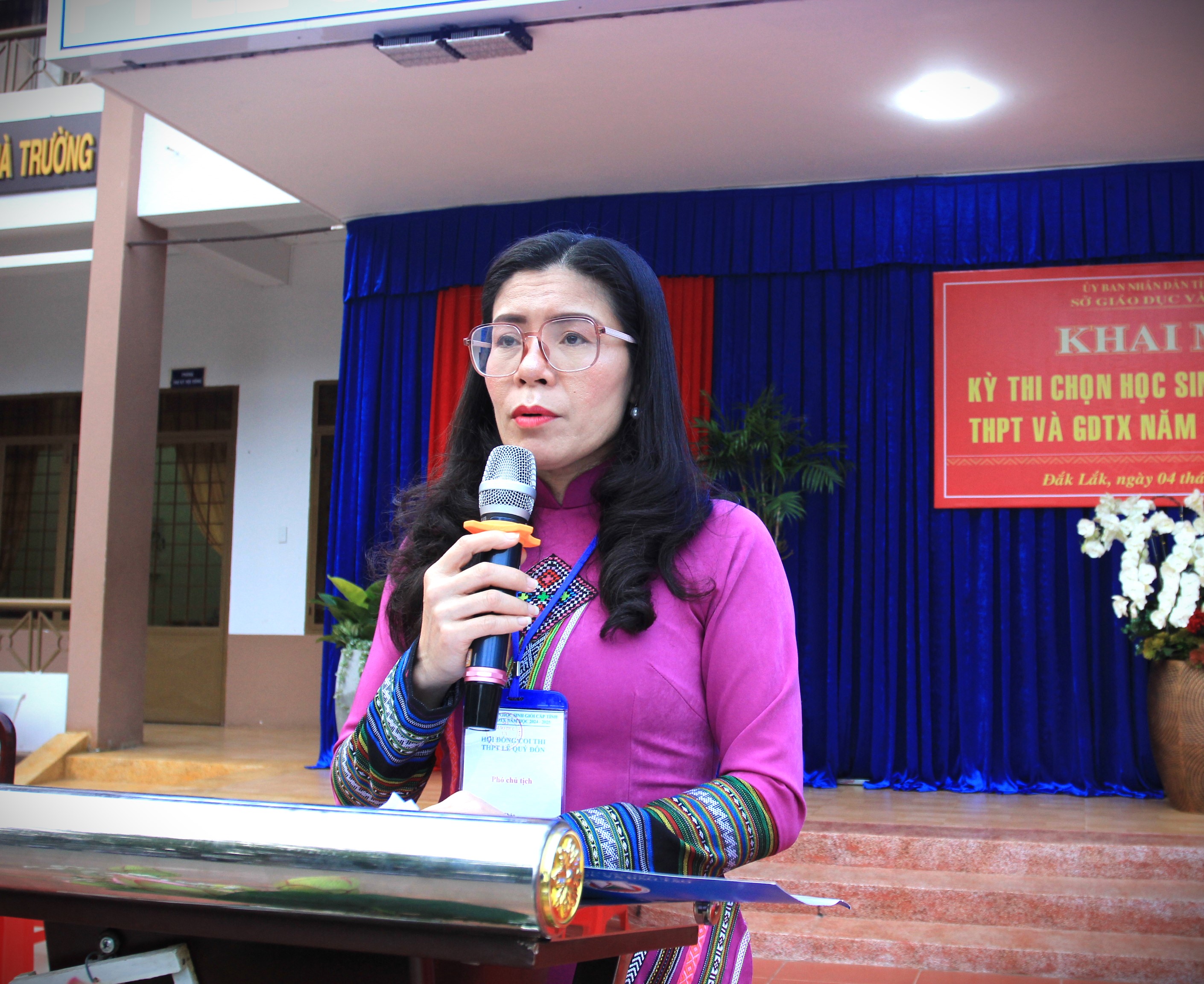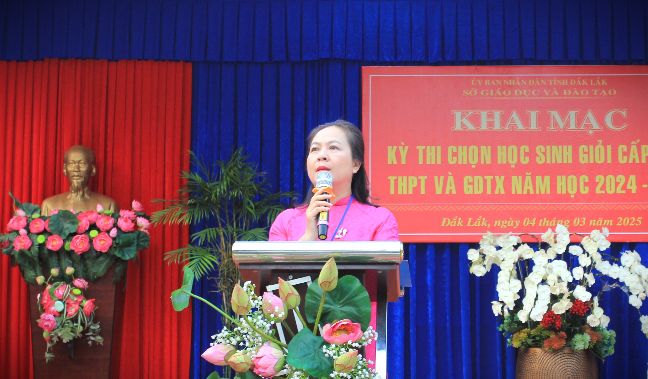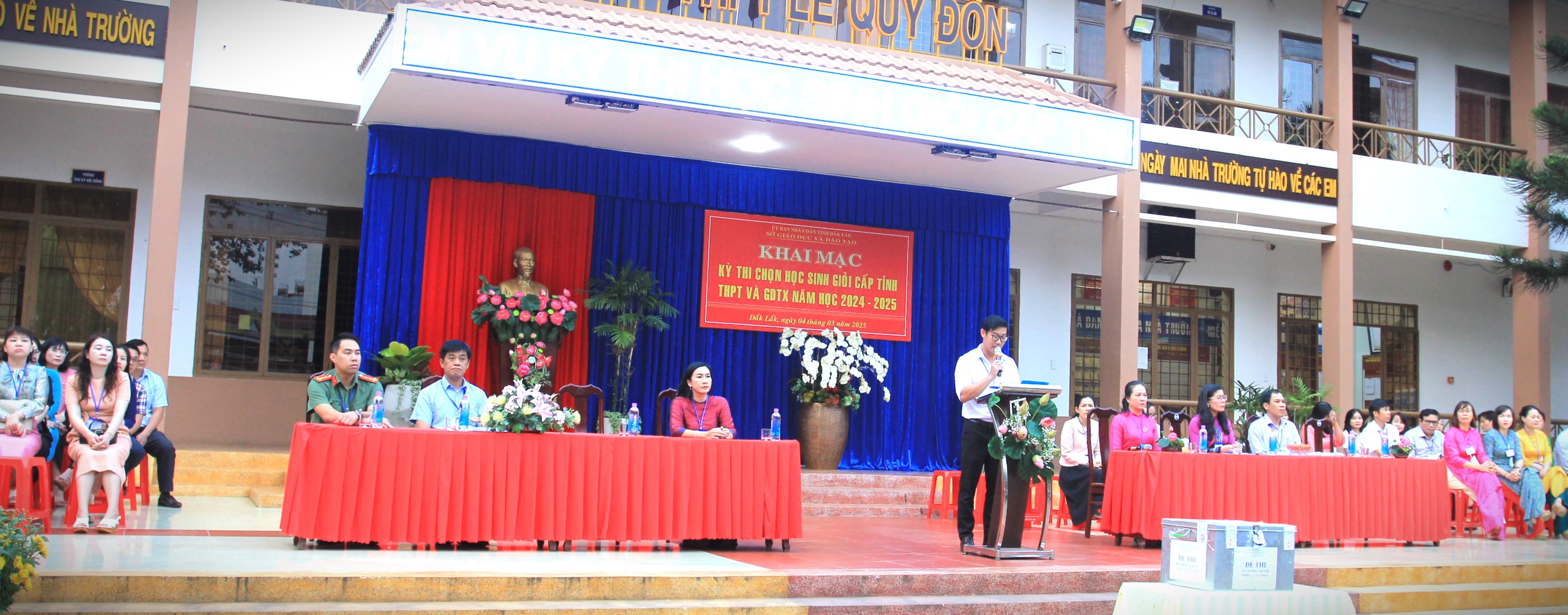 Sáng 4/3, Sở Giáo dục và Đào tạo (GDĐT) tổ chức khai mạc Kỳ thi chọn học sinh giỏi tỉnh cấp trung học phổ thông (THPT), giáo dục thường xuyên (GDTX) năm học 2024 – 2025 tại 02 Hội đồng thi, THPT Buôn Ma Thuột và THPT Lê Quý Đôn. Tham dự lễ khai mạc tại Hội đồng thi THPT Buôn Ma Thuột có ông Đỗ Tường Hiệp – Phó Giám đốc Sở GDĐT, Chủ tịch Hội đồng coi thi, tại Hội đồng thi THPT Lê Quý Đôn có bà Lê Thị Kim Oanh – Phó Giám đốc Sở GDĐT, Chủ tịch Hội đồng coi thi; đại diện lãnh đạo các phòng chuyên môn, nghiệp vụ thuộc Sở GDĐT; cán bộ, giáo viên làm công tác coi thi và thí sinh (TS) tham gia dự thi.