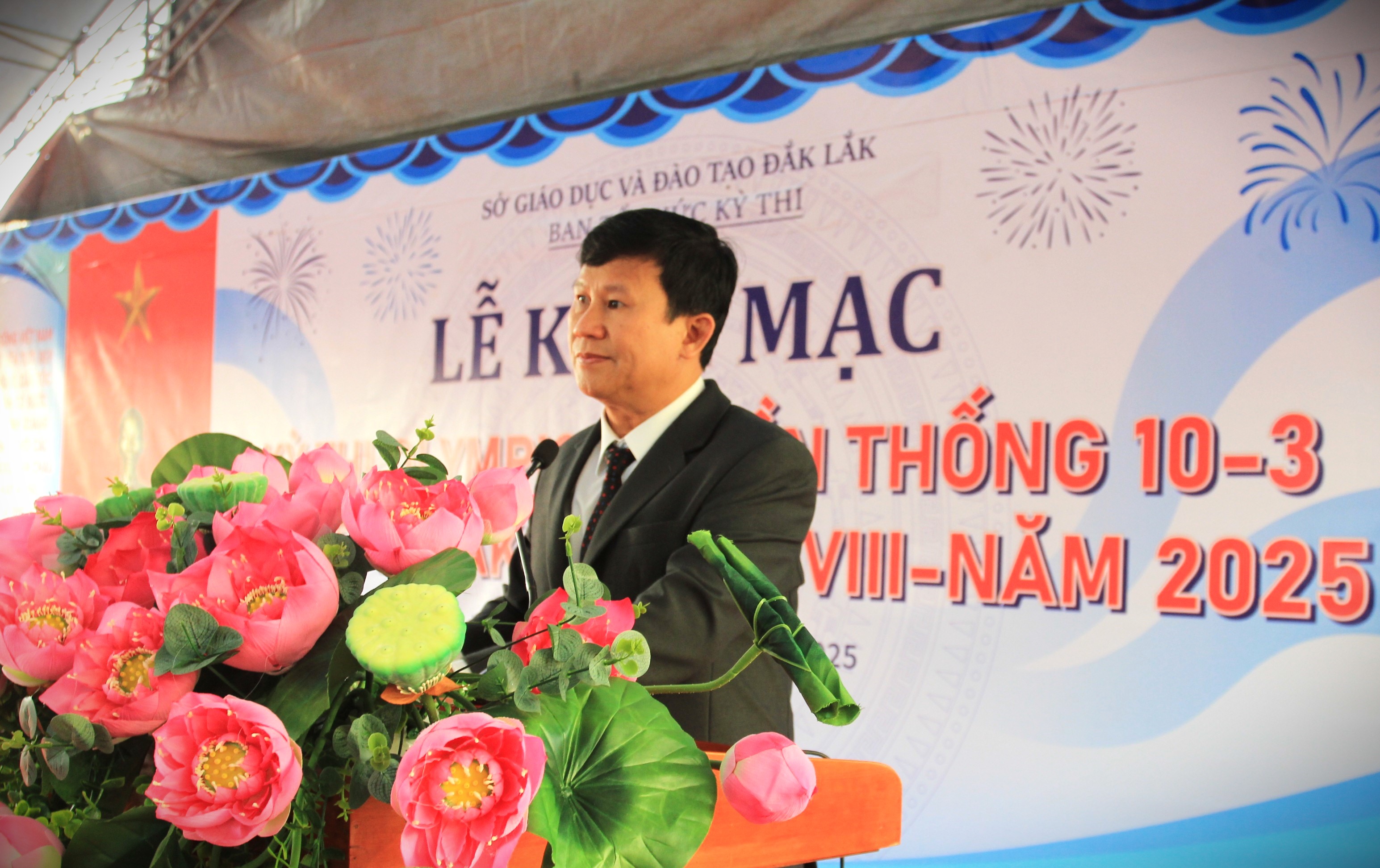 Sáng 01/3, tại Trường THPT Chuyên Nguyễn Du, Sở Giáo dục và Đào tạo (GDĐT) đã tổ chức khai mạc Kỳ thi Olympic truyền thống 10/3 tỉnh Đắk Lắk lần thứ VIII năm 2025. Tham dự lễ khai mạc có TS. Lê Thị Thảo – Trưởng phòng GDTrH-GDTX Sở GDĐT, Phó Trưởng Ban Tổ chức Kỳ thi; thầy giáo Nguyễn Đăng Bồng – Hiệu trưởng trường THPT Chuyên Nguyễn Du, Phó Trưởng Ban Tổ chức kỳ thi, Chủ tịch Hội đồng coi thi; đại diện lãnh đạo các phòng chuyên môn, nghiệp vụ thuộc Sở GDĐT; cán bộ, giáo viên làm công tác coi thi; lãnh đạo, học sinh các đơn vị tham gia dự thi.