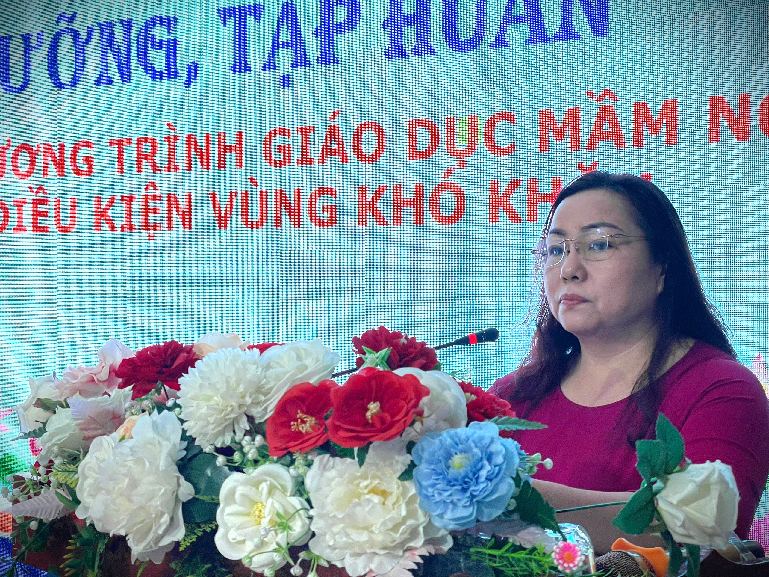 Phát biểu khai mạc lớp tập huấn, bà Võ Thị Phượng – Phó Trưởng phòng, phụ trách phòng GDMN-GDDT, Sở GDĐT nhấn mạnh: Giáo dục mầm non là cấp học nền tảng, đóng vai trò vô cùng quan trọng trong việc hình thành nhân cách, phát triển toàn diện về thể chất và trí tuệ cho trẻ em. Vì vậy, ngành giáo dục và đào tạo đã tăng cường chỉ đạo các cơ sở giáo dục nỗ lực nâng cao chất lượng giáo dục mầm non, trong đó việc phát triển chương trình giáo dục mầm non thuộc vùng khó khăn, vùng sâu, vùng xa, vùng dân tộc thiểu số có vai trò đặc biệt quan trọng đối với việc nâng cao chất lượng giáo dục của cấp học mầm non. Mục tiêu của chương trình hỗ trợ phát triển giáo dục mầm non vùng khó khăn, tạo cơ hội cho trẻ em vùng khó khăn được tiếp cận giáo dục mầm non có chất lượng; bảo đảm công bằng, rút ngắn khoảng cách phát triển giữa các vùng miền. Tuy nhiên, việc triển khai chương trình vẫn còn gặp nhiều thách thức như điều kiện cơ sở vật chất thiếu thốn, đội ngũ giáo viên chưa đáp ứng yêu cầu, đặc điểm văn hóa, phong tục tập quán của cộng đồng dân cư…