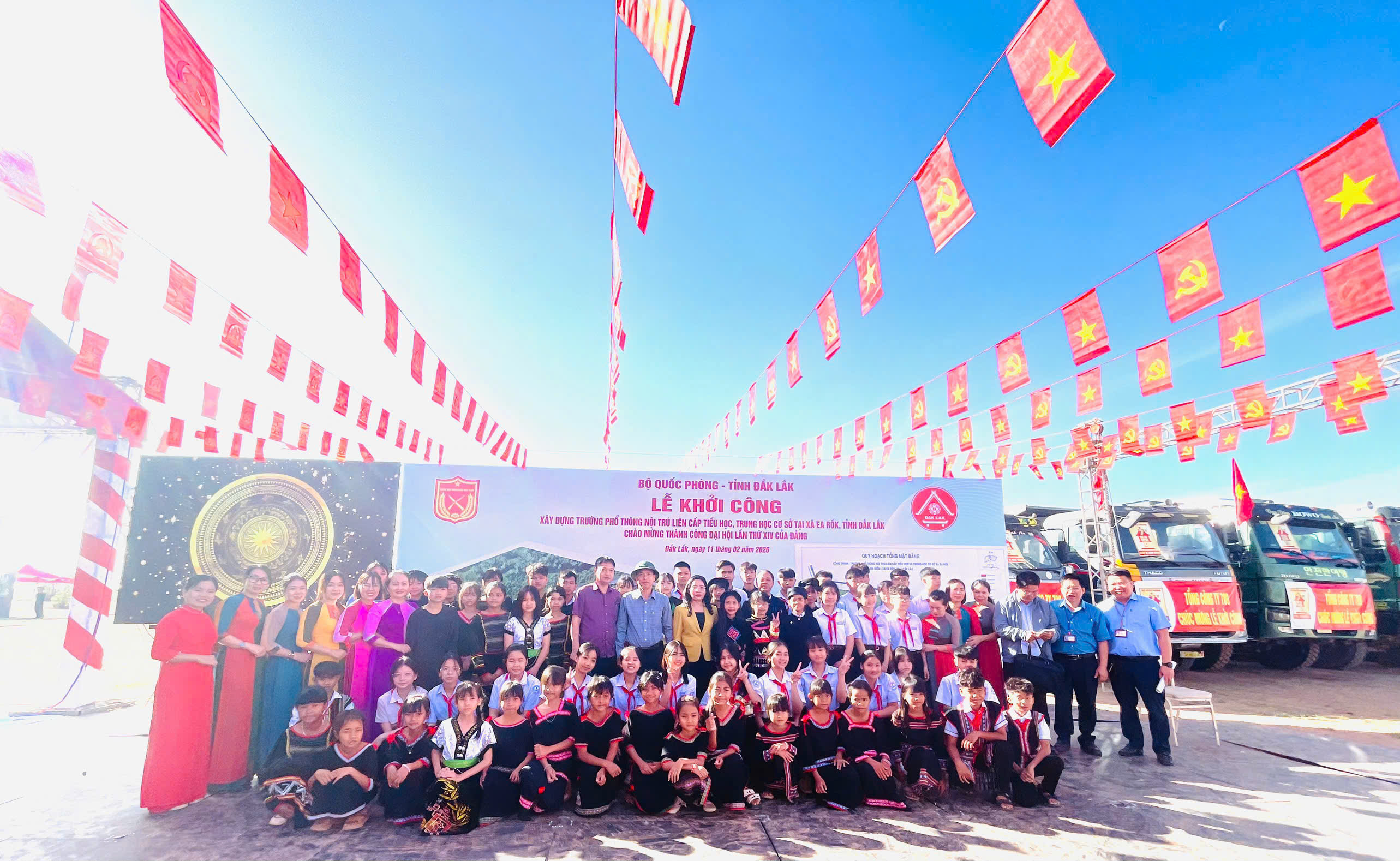 Đại biểu Lê Thị Thanh Xuân (áo vàng chính giữa) chụp ảnh lưu niệm cùng CBQL, GV, học sinh tham gia Lễ khởi công xây dựng Trường Phổ thông Nội trú liên cấp Tiểu học và Trung học cơ sở tại xã biên giới Ea Rốk