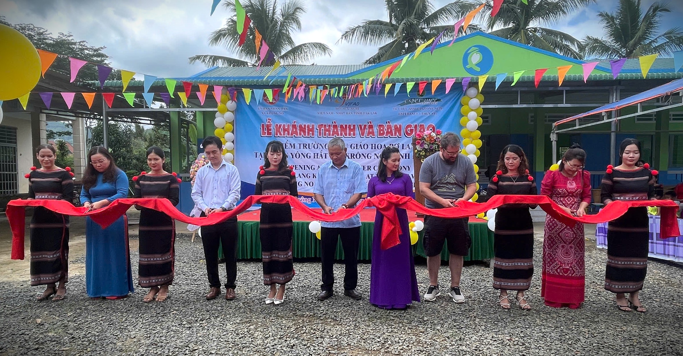 Các đại biểu cắt băng khánh thành Điểm trường Mẫu giáo Hoa Pơ Lang, Buôn Yông Hắt, xã Krông Nô