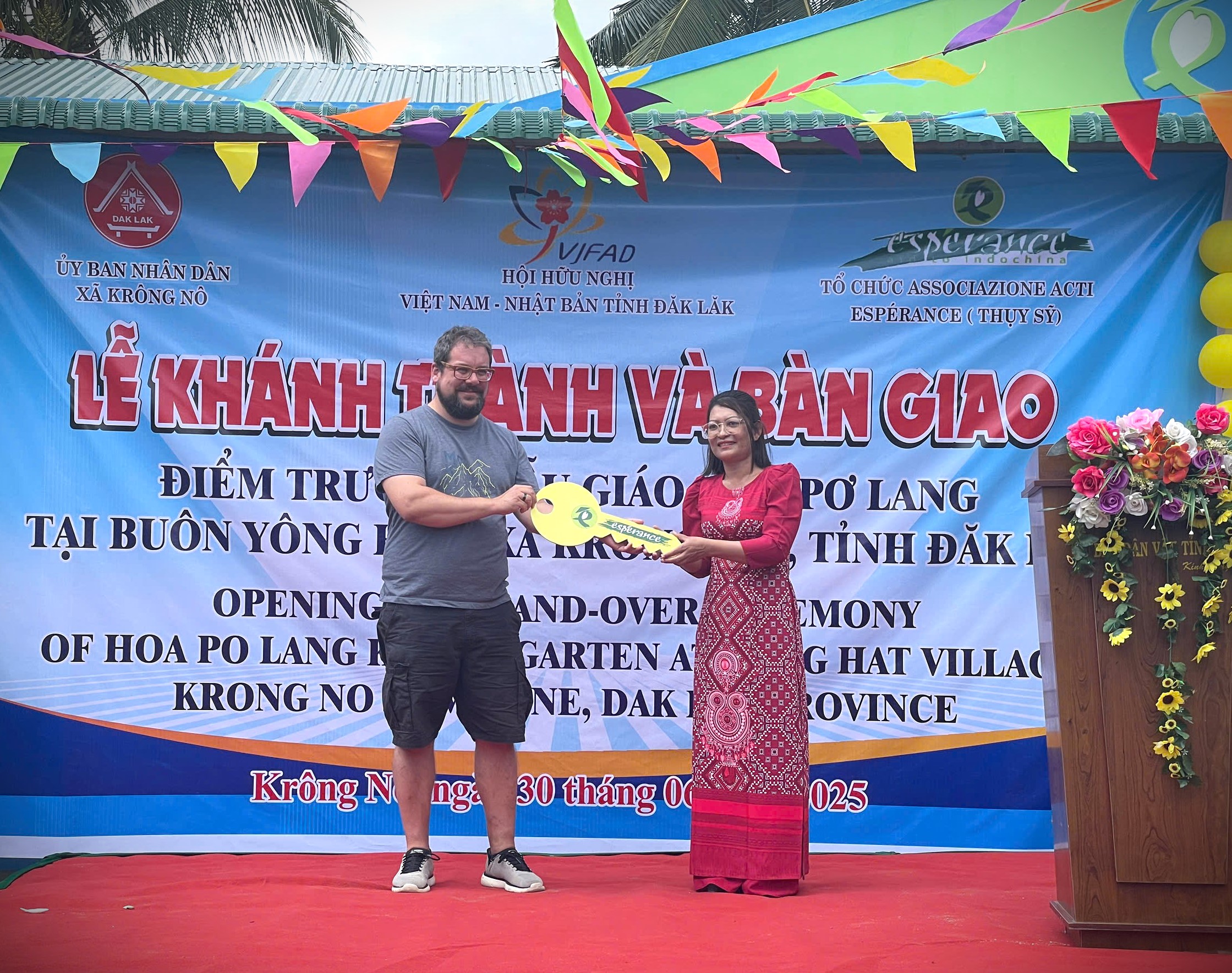 Sáng 30/6, Hội Hữu nghị Việt Nam – Nhật Bản, tỉnh Đắk Lắk phối hợp với UBND huyện Lắk và Đoàn công tác (thuộc Tổ chức Associazione ACTI Espérance - Thụy Sĩ), tổ chức Lễ khánh thành và bàn giao Điểm trường Mẫu giáo Hoa Pơ Lang tại Buôn Yông Hắt, xã Krông Nô, huyện Lắk, tỉnh Đắk Lắk.