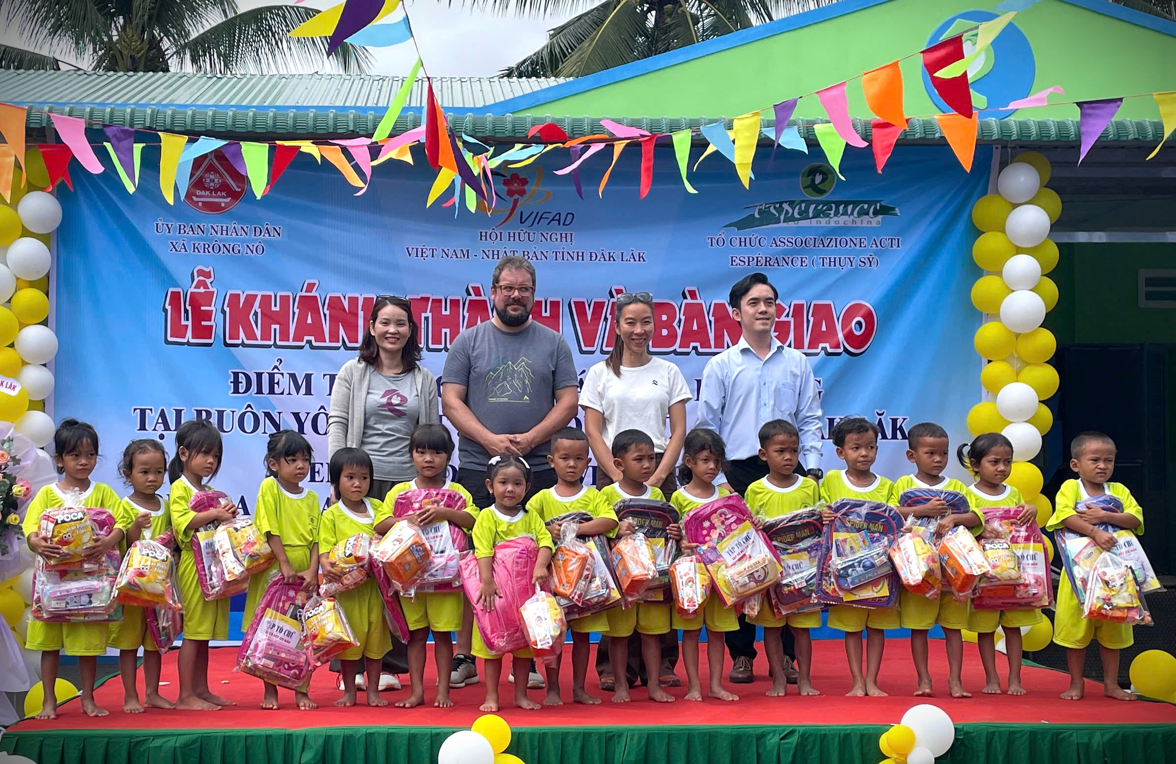 Tại Buổi Khánh thành, Tổ chức Associazione ACTI Espérance cũng đã trao 60 suất quà gồm quần áo, balo, bánh kẹo…cho các em nhỏ của Điểm trường Mẫu giáo Hoa Pơ Lang.
