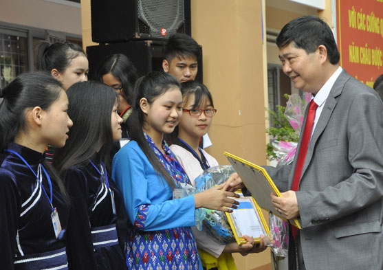 Giám đốc Sở GD-ĐT Phạm Đăng Khoa trao học bổng tặng học sinh Trường THPT Dân tộc nội trú Nơ Trang Lơng. Ảnh: N.Hoa