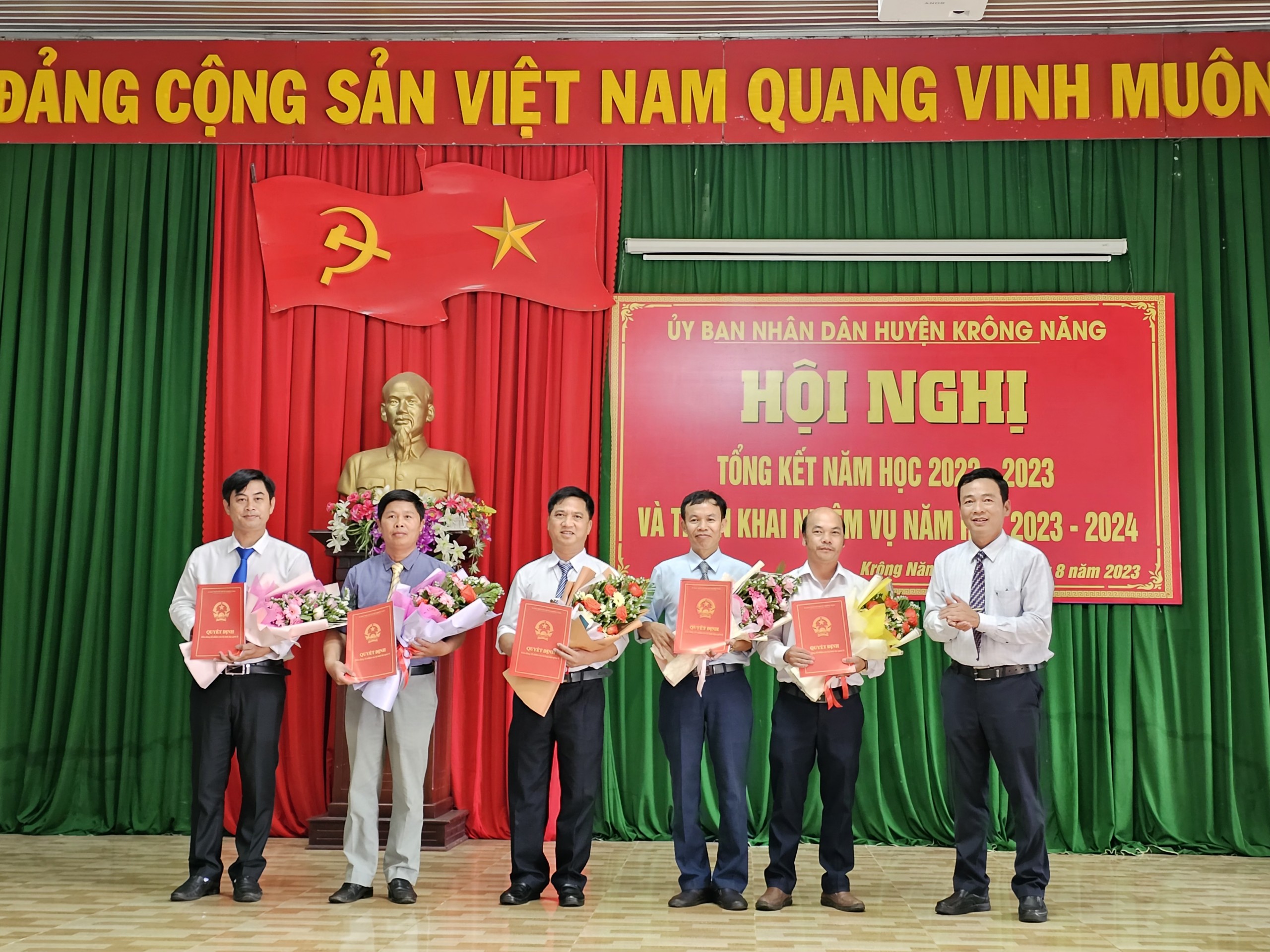 Ông Trần Minh Châu - Huyện ủy viên, Phó Chủ tịch UBND huyện Krông Năng trao Quyết định và tặng hoa chúc mừng 05 cán bộ quản lý các trường học được điều động, bổ nhiệm đầu năm học mới