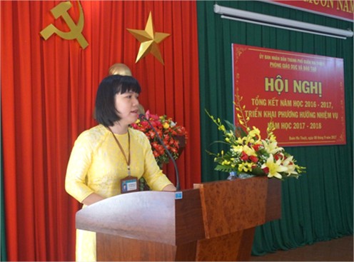 Bà Mai Thị Hồng Hà – Phó Trưởng phòng GDĐT báo cáo tổng kết năm học 2016-2017: Năm học 2016-2017, toàn ngành GDĐT Tp. Buôn Ma Thuột có 128 trường, 2.099 lớp với 71.060 học sinh (trong đó có 11.719 học sinh là người đồng bào dân tộc thiểu số) từ mầm non đến phổ thông. Chất lượng giáo dục ngày càng được nâng lên, mạng lưới giáo dục mầm non không ngừng phát triển. Phòng đã tổ chức triển khai thực hiện nghiêm túc các nhiệm vụ trọng tâm trong năm học và đã đạt được những kết quả khả quan về đổi mới phương pháp giảng dạy, về chất lượng giáo dục đào tạo. Các cấp ủy, chính quyền, các đoàn thể xã hội, phụ huynh học sinh tích cực hưởng ứng chăm lo giáo dục thế hệ trẻ, quan tâm đến việc giáo dục giúp đỡ học sinh yếu, học sinh có hoàn cảnh khó khăn, hạn chế số lượng học sinh bỏ học.