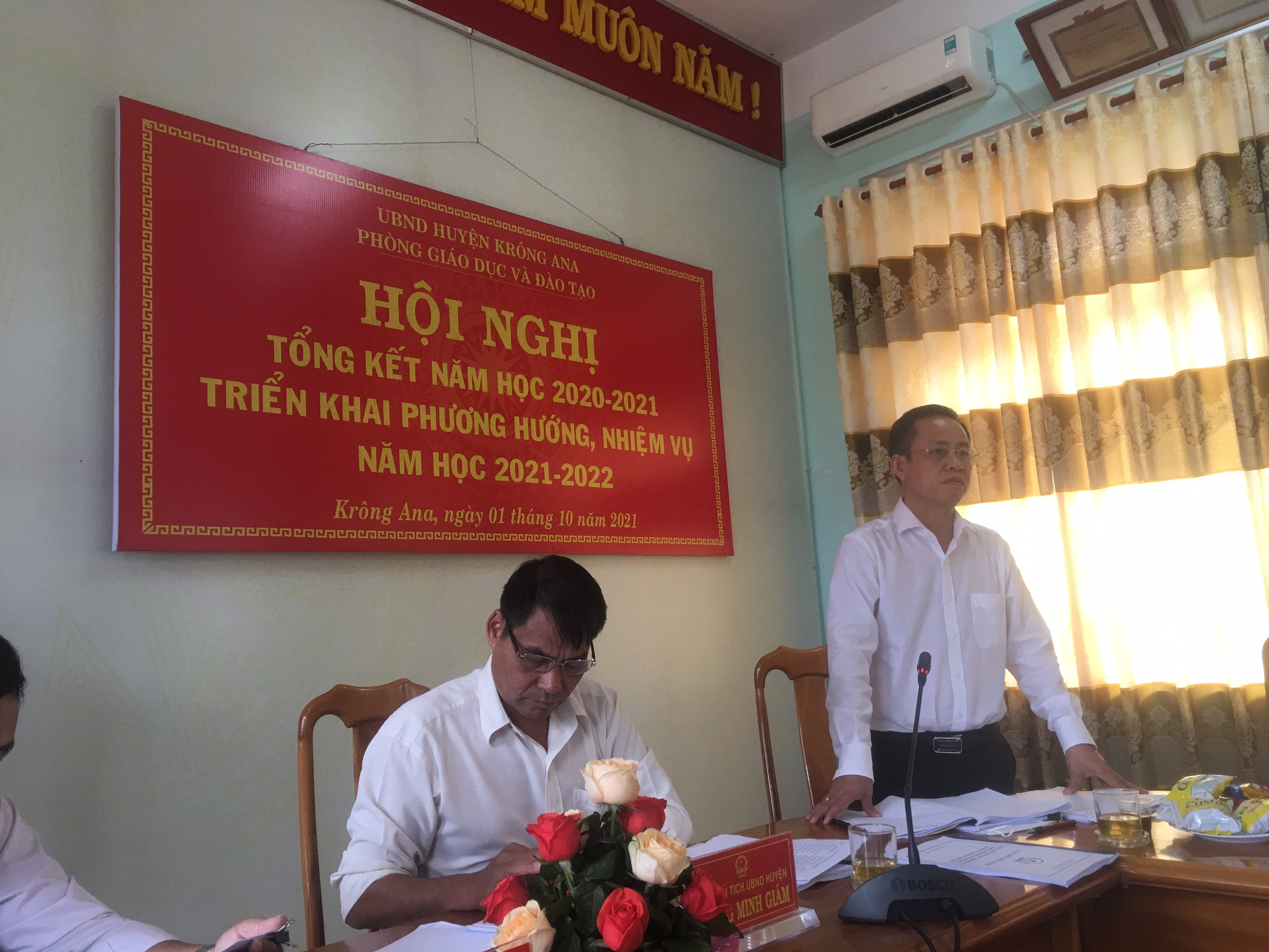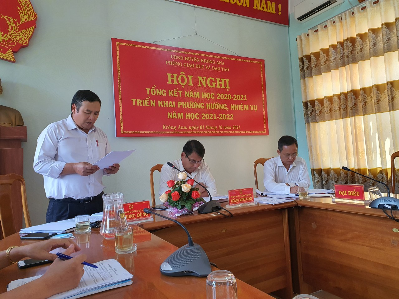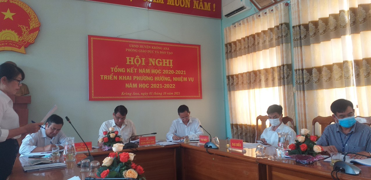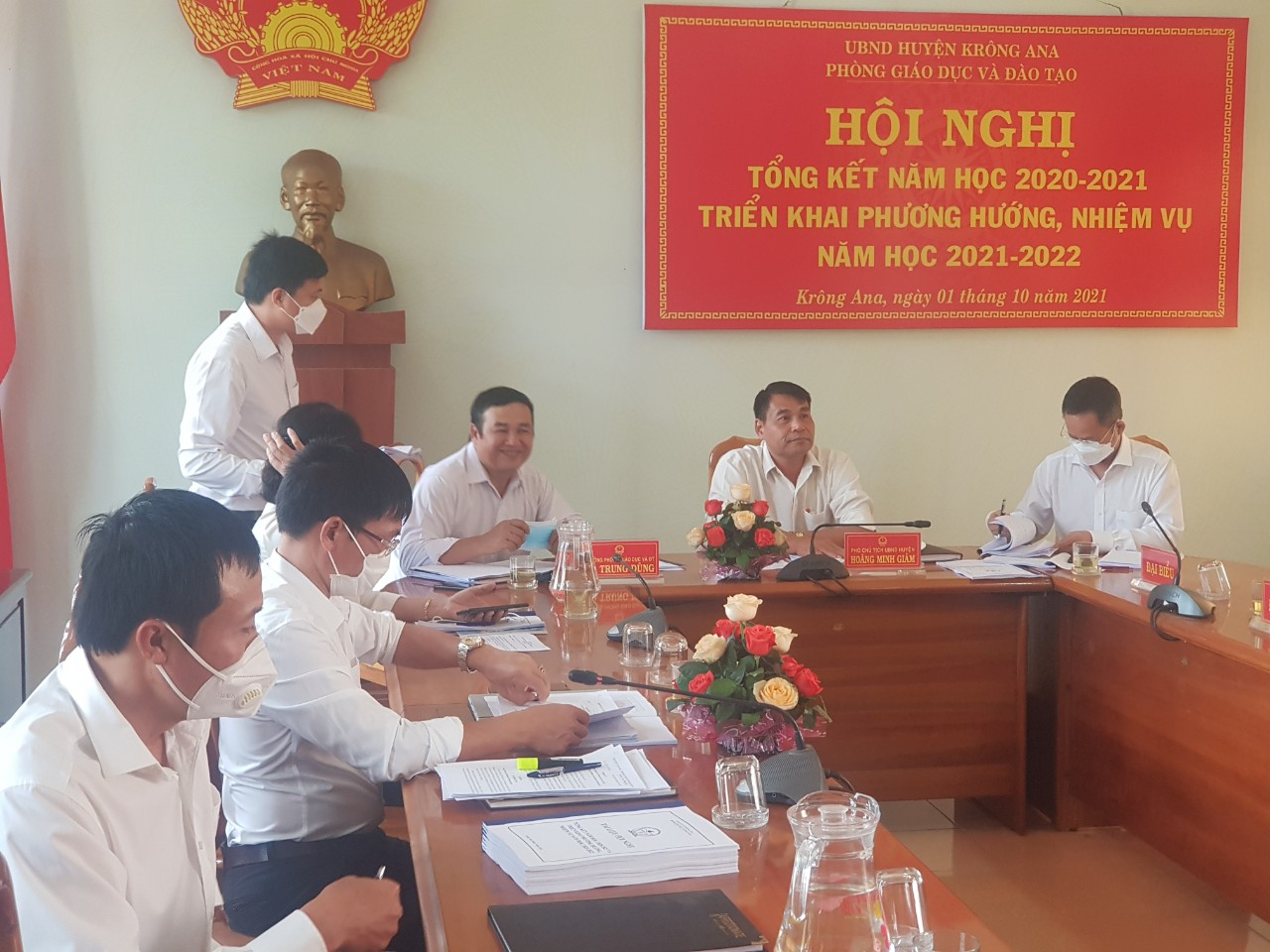Ngày 01/10/2021, Phòng Giáo dục và Đào tạo (GDĐT) huyện Krông Ana tổ chức Hội nghị tổng kết năm học 2020 - 2021 và triển khai nhiệm vụ năm học 2021-2022 bằng hình thức trực tuyến từ đầu cầu UBND huyện và các điểm cầu đặt tại UBND các xã, thị trấn. Hội nghị do ông Hoàng Minh Giám, Phó Chủ tịch thường trực UBND huyện chủ trì. Dự Hội nghị có ông Đỗ Tường Hiệp - Phó Giám đốc Sở GDĐT, đồng chí Nguyễn Năng Lưu - Trưởng Ban dân vận huyện ủy, Chủ tịch UBMT Tổ quốc Việt Nam huyện; đại diện lãnh đạo các phòng, ban, ngành, đoàn thể của huyện; lãnh đạo UBND các xã, thị trấn; lãnh đạo các trường THCS; Tiểu học; Mầm non trên địa bàn huyện.