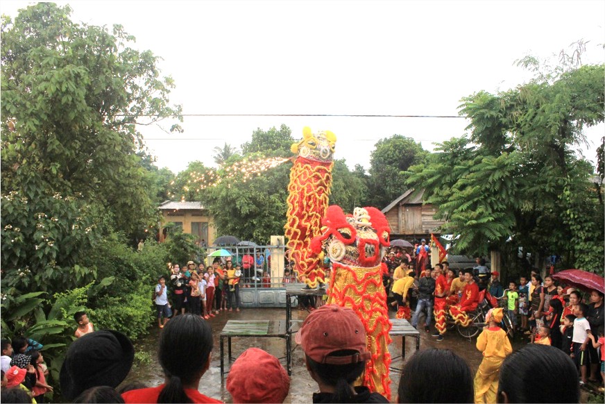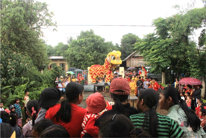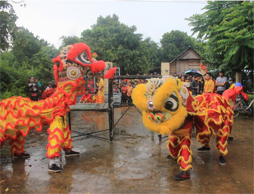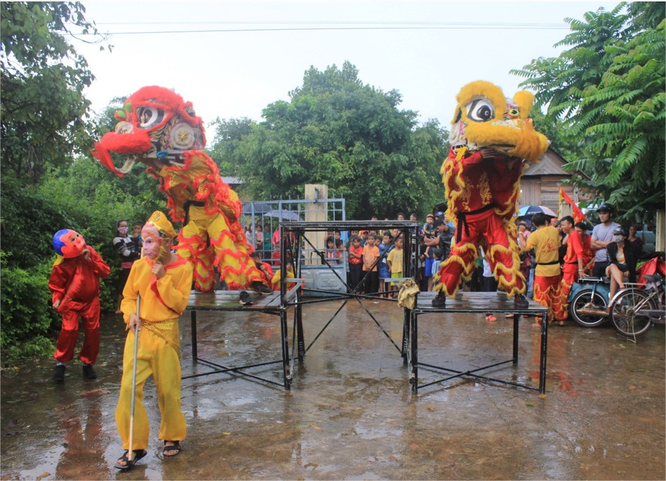Tiết mục múa lân tại nhà cộng đồng Buôn Knia 3