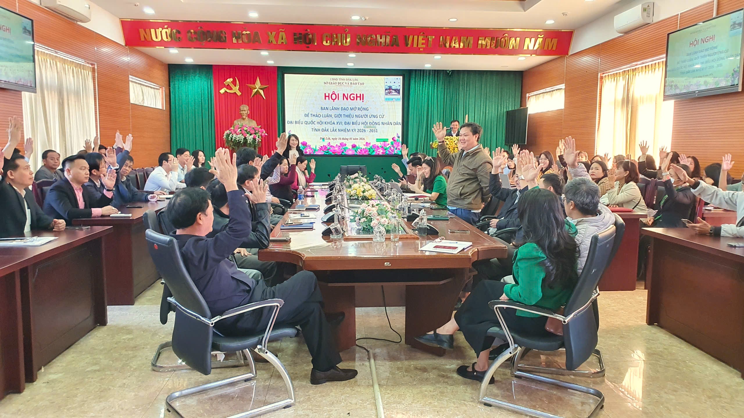 Thực hiện Luật Bầu cử đại biểu Quốc hội và đại biểu Hội đồng nhân dân; căn cứ các nghị quyết, hướng dẫn của Ủy ban Thường vụ Quốc hội, Hội đồng bầu cử quốc gia và Ủy ban Mặt trận Tổ quốc Việt Nam; trong hai ngày 15 - 16/01/2026, Sở Giáo dục và Đào tạo tổ chức Hội nghị lấy ý kiến cử tri nơi công tác đối với người được dự kiến giới thiệu ứng cử đại biểu Quốc hội khóa XVI và đại biểu Hội đồng nhân dân tỉnh nhiệm kỳ 2026 - 2031 và Hội nghị Ban lãnh đạo mở rộng để thảo luận, giới thiệu người ứng cử đại biểu Quốc hội khóa XVI và đại biểu Hội đồng nhân dân tỉnh nhiệm kỳ 2026 - 2031 theo đúng quy trình, trình tự quy định.