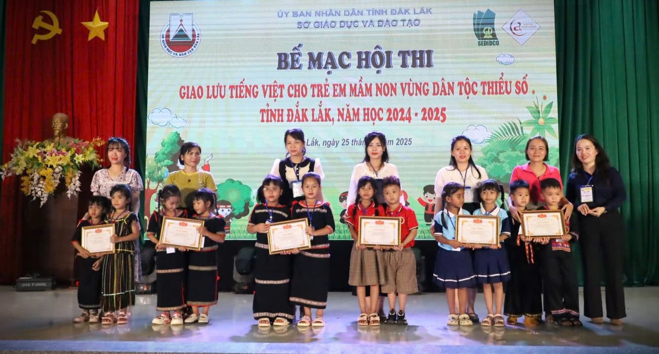 Hội thi Giao lưu tiếng Việt cho trẻ em mầm non vùng dân tộc thiểu số tỉnh Đắk Lắk, năm học 2024–2025 là sân chơi bổ ích, thiết thực cho trẻ mầm non dân tộc thiểu số thể hiện khả năng sử dụng tiếng Việt qua lời nói, câu chuyện, bài hát, trò chơi…; là dịp để các thầy cô giáo chia sẻ kinh nghiệm, cùng nhau tìm ra những phương pháp dạy học hiệu quả, gần gũi và phù hợp với trẻ em vùng đồng bào dân tộc thiểu số.