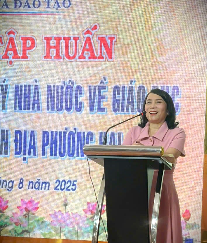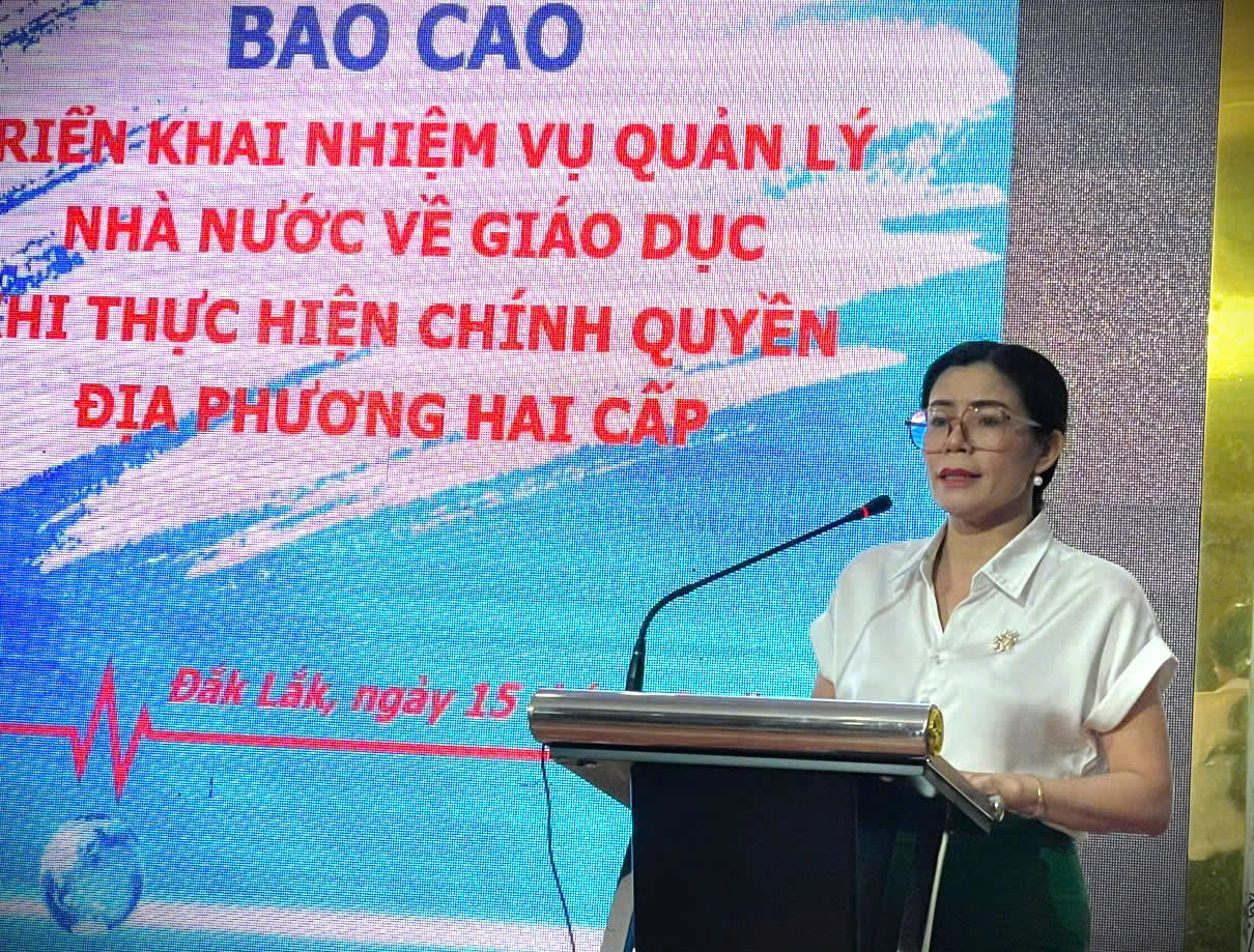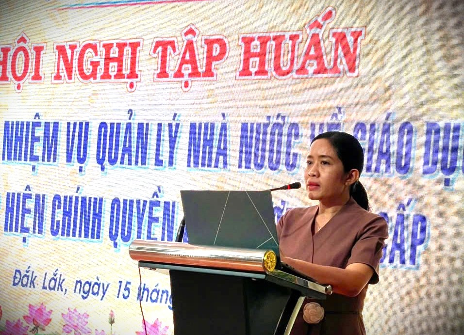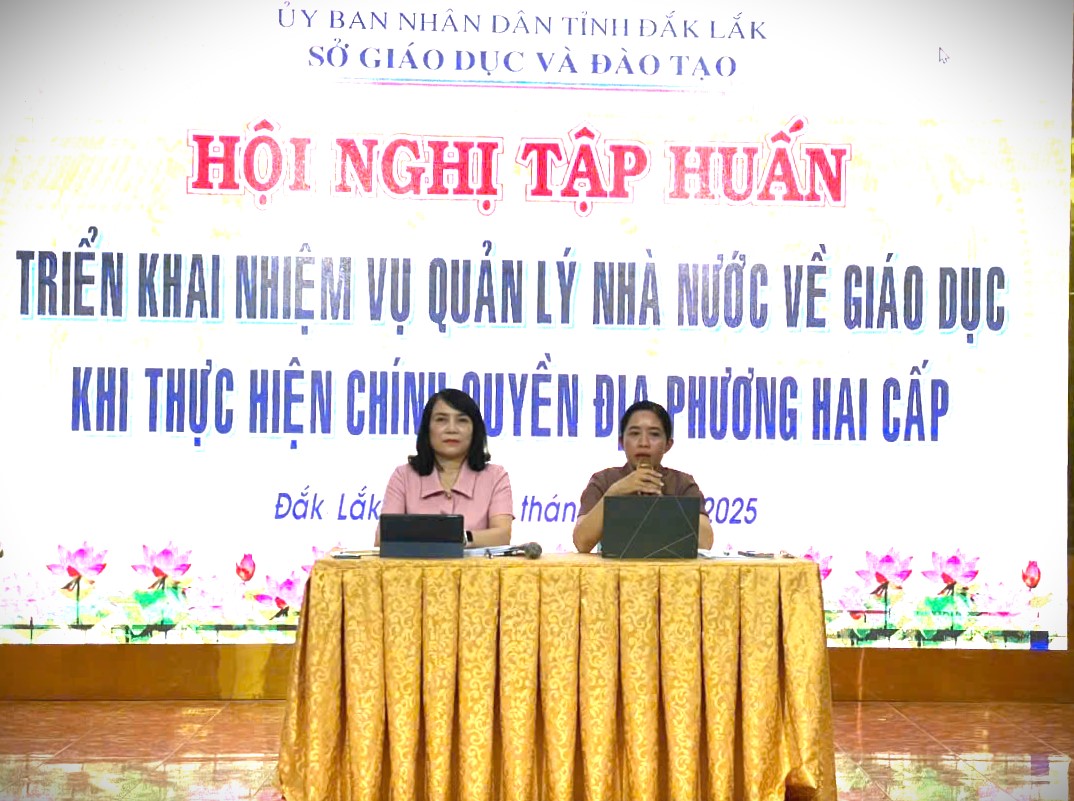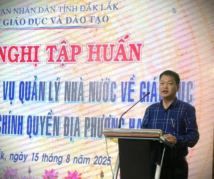 Sáng ngày 15/8/2025, tại Hội trường Khách sạn Công đoàn Ban Mê, tỉnh Đắk Lắk, Sở Giáo dục và Đào tạo (GDĐT) tổ chức Hội nghị tập huấn triển khai nhiệm vụ quản lý nhà nước về giáo dục khi thực hiện chính quyền địa phương hai cấp. Tham dự và chủ trì Hội nghị có bà Lê Thị Thanh Xuân, Tỉnh uỷ viên, Giám đốc Sở GDĐT và bà Võ Thị Minh Duyên - Phó Giám đốc Sở GDĐT đồng chủ trì Hội nghị; đại diện lãnh đạo các phòng chuyên môn, nghiệp vụ thuộc Sở GDĐT; toàn thể lãnh đạo, chuyên viên phòng Giáo dục Phổ thông; đại diện lãnh đạo UBND các xã, phường và đại diện lãnh đạo, chuyên viên phụ trách giáo dục của phòng Văn hóa - Xã hội các xã, phường trên địa bàn toàn tỉnh.