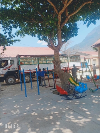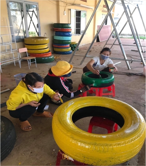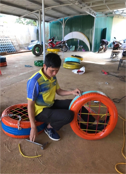 Giáo viên trường TH Ngô Gia Tự, huyện Krông Pắc làm đồ chơi ngoài trời cho học sinh