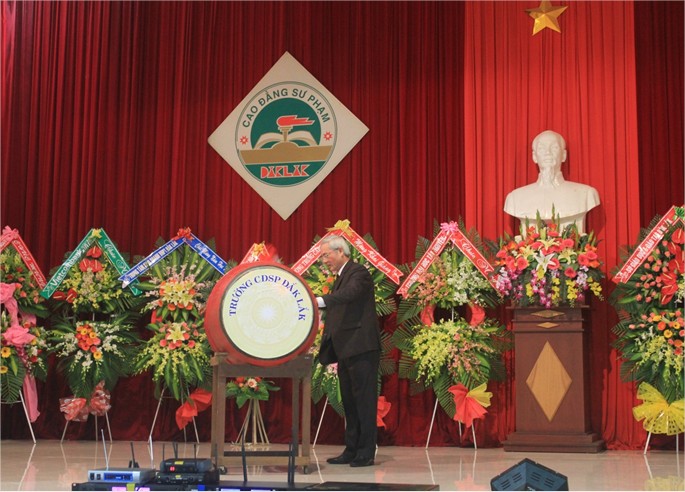 Tiến sĩ Nguyễn Trọng Hòa, Hiệu trưởng Trường CĐSP Đắk Lắk đánh trống khai giảng năm học mới