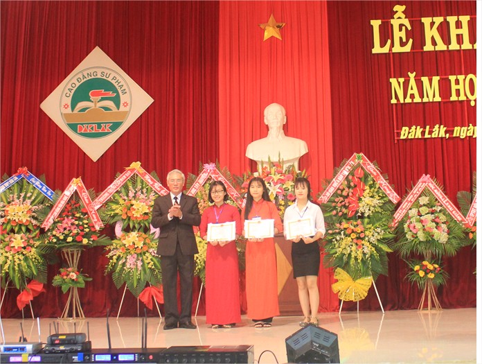 Với những thành tích đã đạt được trong năm học vừa qua, Trường CĐSP Đắk Lắk đã vinh dự được UBND tỉnh trao tặng Bằng khen và công nhận nhà trường Tập thể Lao động Xuất sắc.