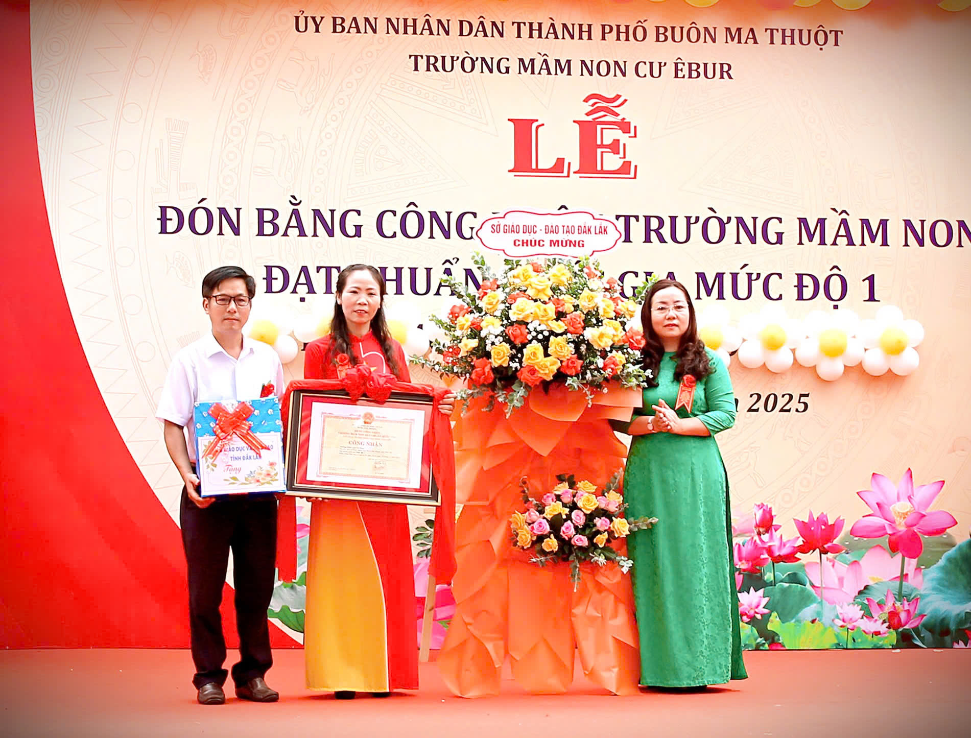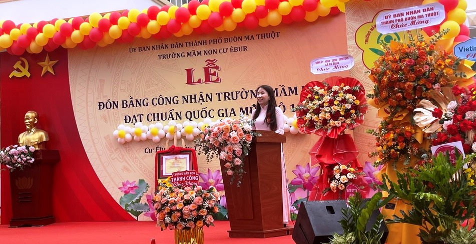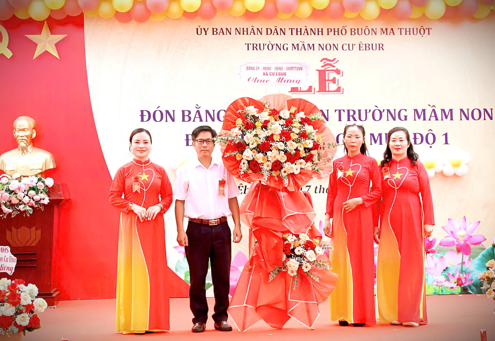 Sáng ngày 17/05, Trường Mầm non Cư Êbur, thành phố Buôn Ma Thuột đã long trọng tổ chức lễ đón nhận Bằng công nhận trường đạt chuẩn quốc gia mức độ 1. Tham dự buổi lễ có bà Võ Thị Phượng – Phó Trưởng phòng, phụ trách phòng GDMN-GDDT Sở Giáo dục và Đào tạo (GDĐT); bà Sa Ly Niê – Phó Trưởng phòng GDĐT thành phố Buôn Ma Thuột; đại diện lãnh đạo các phòng, ban thuộc UBND thành phố Buôn Ma Thuột; đại diện lãnh đạo đảng, chính quyền địa phương và toàn thể cán bộ, giáo viên, người lao động, phụ huynh, học sinh trường mầm non Cư Êbur.