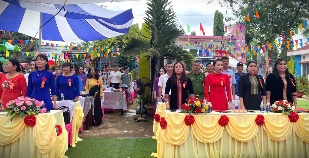 Phát biểu tại buổi lễ, bà Sa Ly Niê – Phó Trưởng phòng GDĐT thành phố Buôn Ma Thuột biểu dương và ghi nhận những thành tích mà Nhà trường đã đạt được trong thời gian qua; nhìn lại chặng đường phấn đấu 10 năm kể từ khi đạt chuẩn quốc gia mức độ 1 đến nay, từ một ngôi trường đóng chân trên địa bàn xã cách xa trung tâm thành phố, học sinh đa phần là người DTTS, điều kiện gia đình còn nhiều khó khăn, tuy nhiên với sự nỗ lực, cố gắng của cô và trò của nhà trường, sự quan tâm của chính quyền địa phương và sự phối hợp giữa cha mẹ học sinh đã giúp nhà trường đạt được thành quả hôm nay; cơ sở vật chất khang trang, có đầy đủ phòng học, phòng chức năng, khu nhà hiệu bộ và khu bếp rộng, thoáng, sạch sẽ, các điểm trường đều có phòng học và nhà bếp đảm bảo phục vụ tốt cho trẻ đến trường; đội ngũ giáo viên nhiệt huyết, yêu nghề, mến trẻ và hoàn thành xuất sắc nhiệm vụ chuyên môn; sự lãnh đạo của tập thể Ban giám hiệu nhà trường tạo được sự đồng đồng thuận, thống nhất, đoàn kết cao… đồng thời, Phó Trưởng phòng GDĐT đề nghị, trong thời gian tới các cấp, các ngành tiếp tục quan tâm, hỗ trợ về chuyên môn, cơ sở vật chất, đội ngũ giáo viên cho nhà trường; tăng cường phối hợp trong công tác tuyên truyền, vận động học sinh đến trường; tham mưu, đầu tư, xây dựng cơ sở vật chất khang trang góp phần hướng đến xây dựng nông thôn mới kiểu mẫu tại xã nhà, góp phần nâng cao chất lượng giáo dục toàn diện, vun trồng nên những thế hệ mầm non tương lai, những chủ nhân kỷ nguyên mới của đất nước.