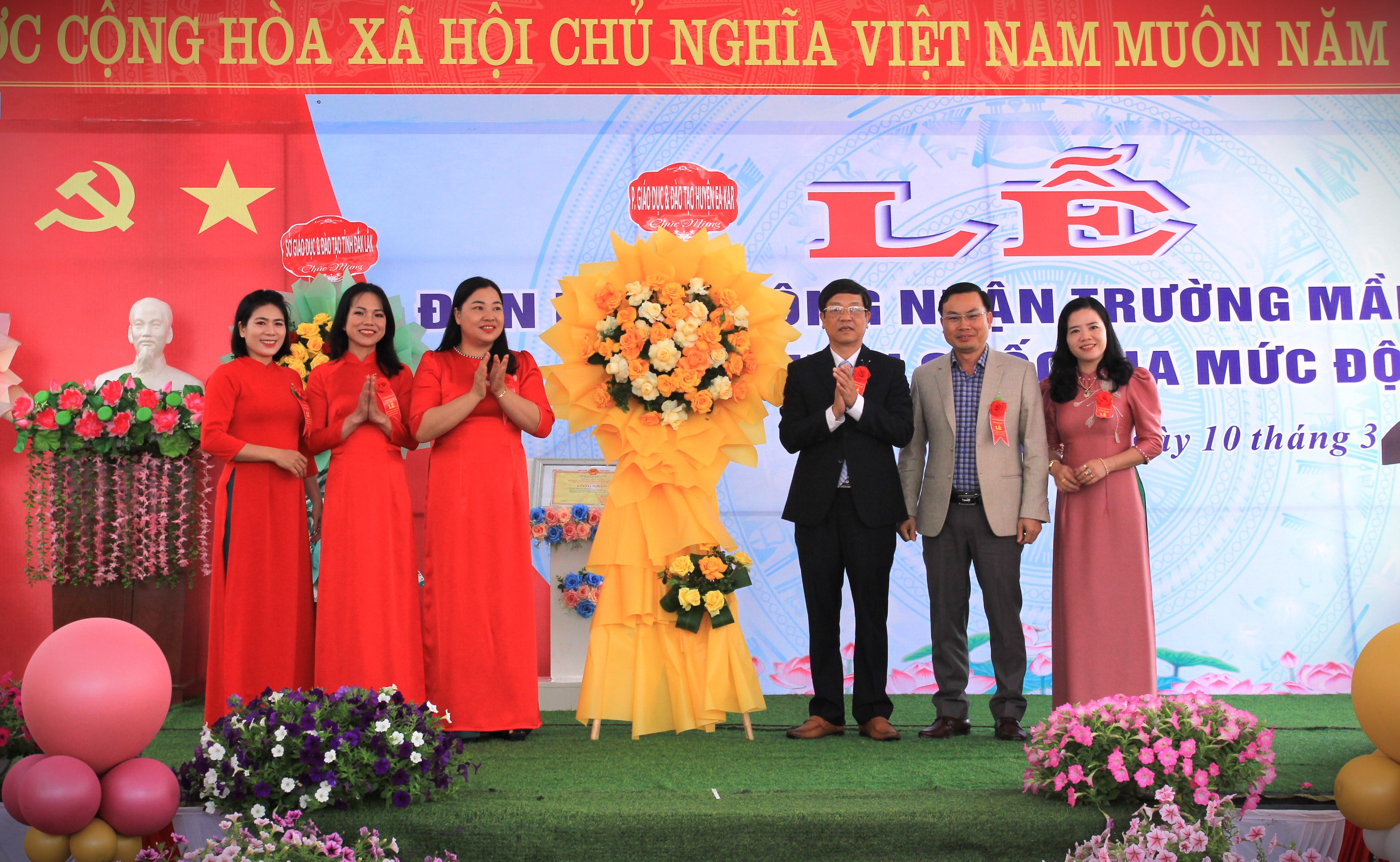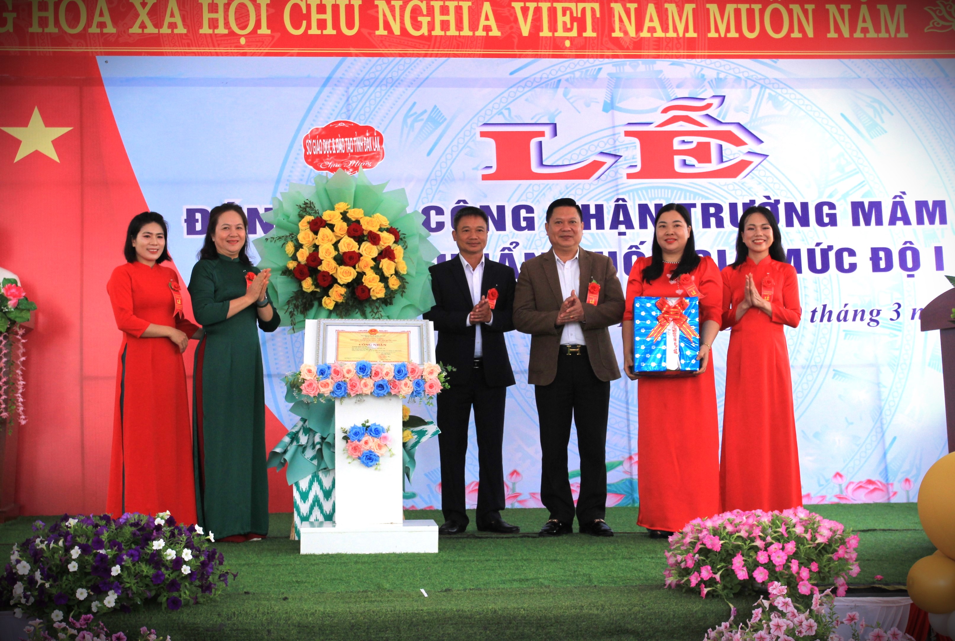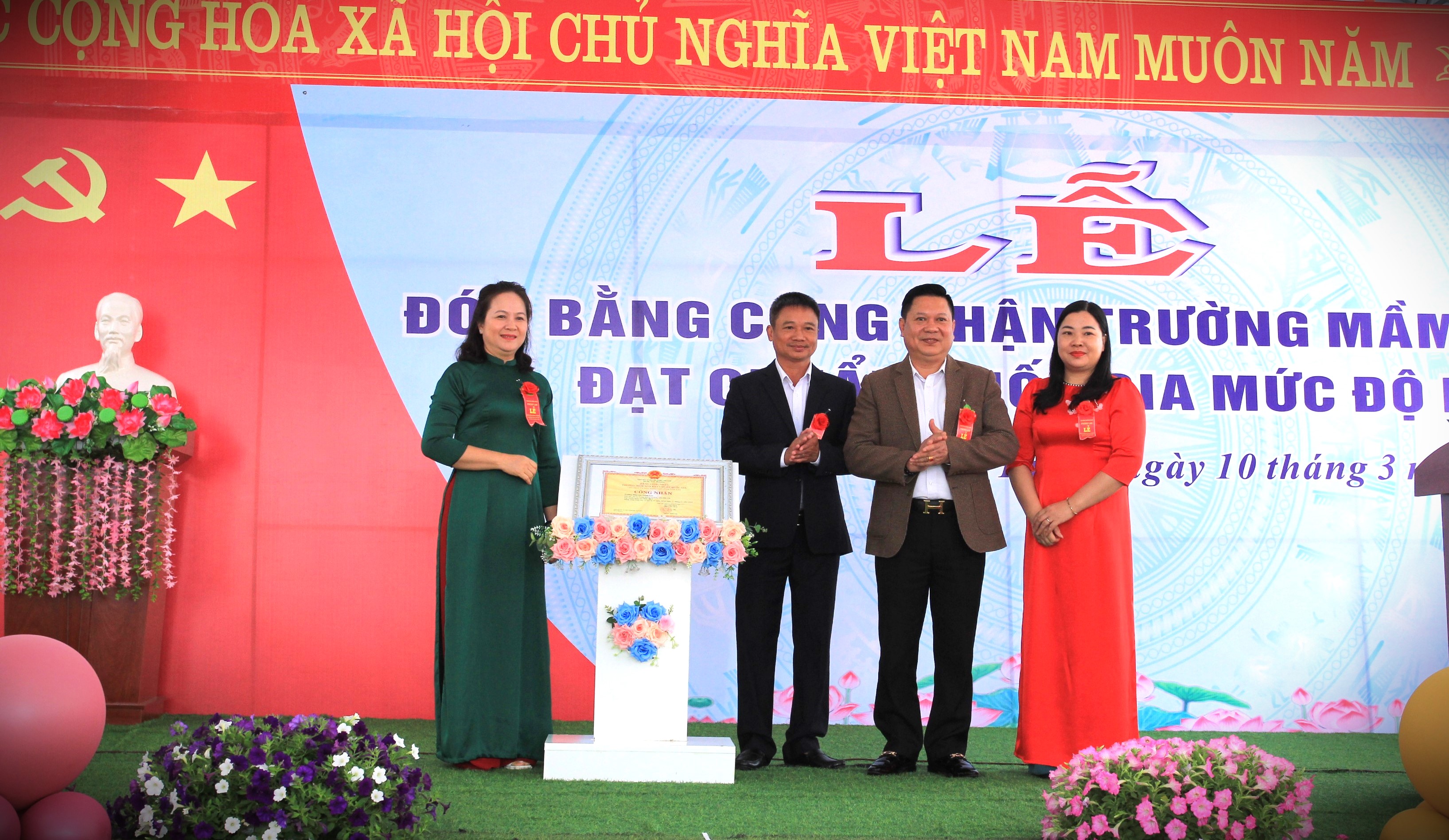 Đại diện lãnh đạo Sở GDĐT và Lãnh đạo chính quyền địa phương trao Bằng công nhận trường Mầm non Phong Lan đạt chuẩn quốc gia mức độ 1