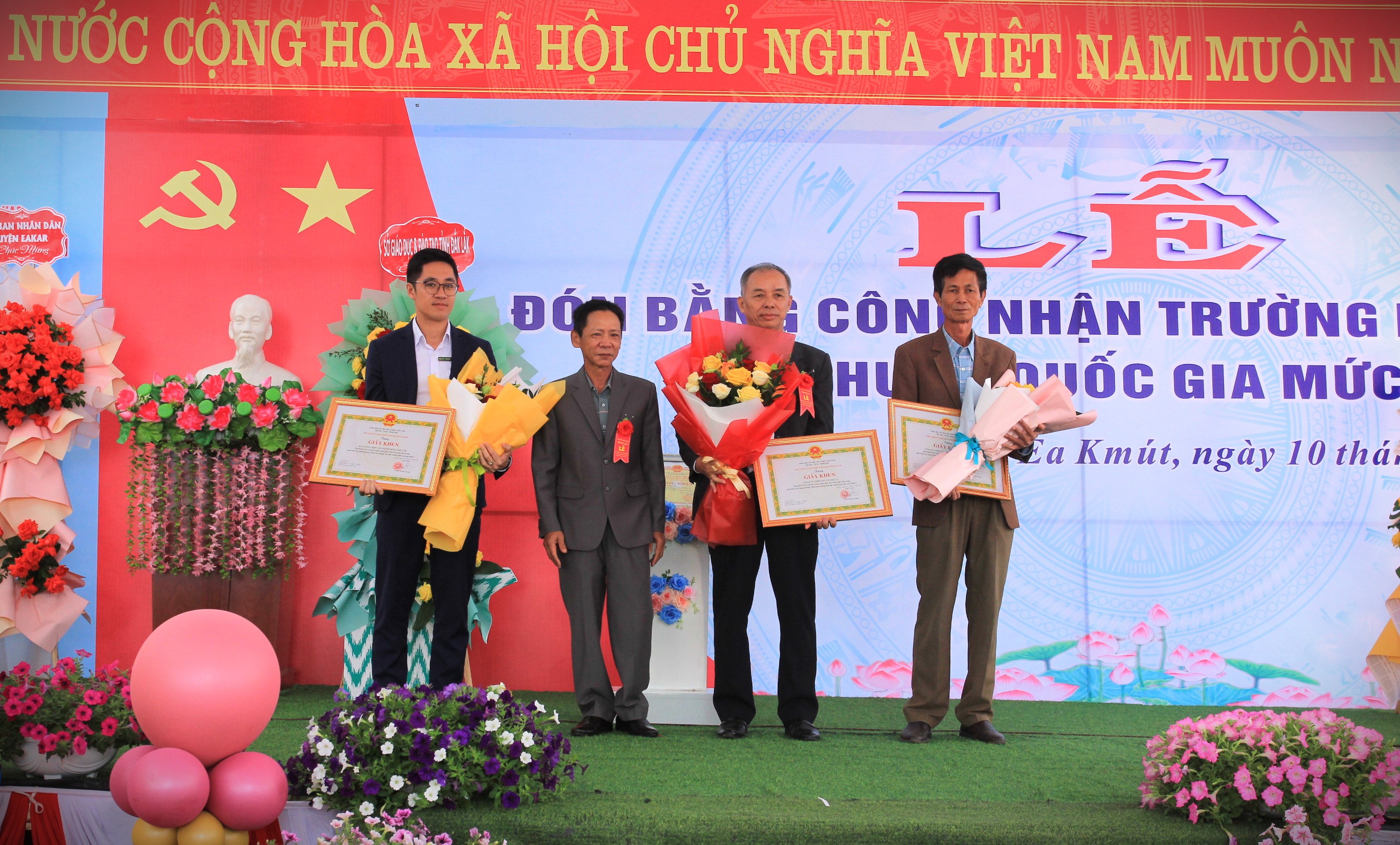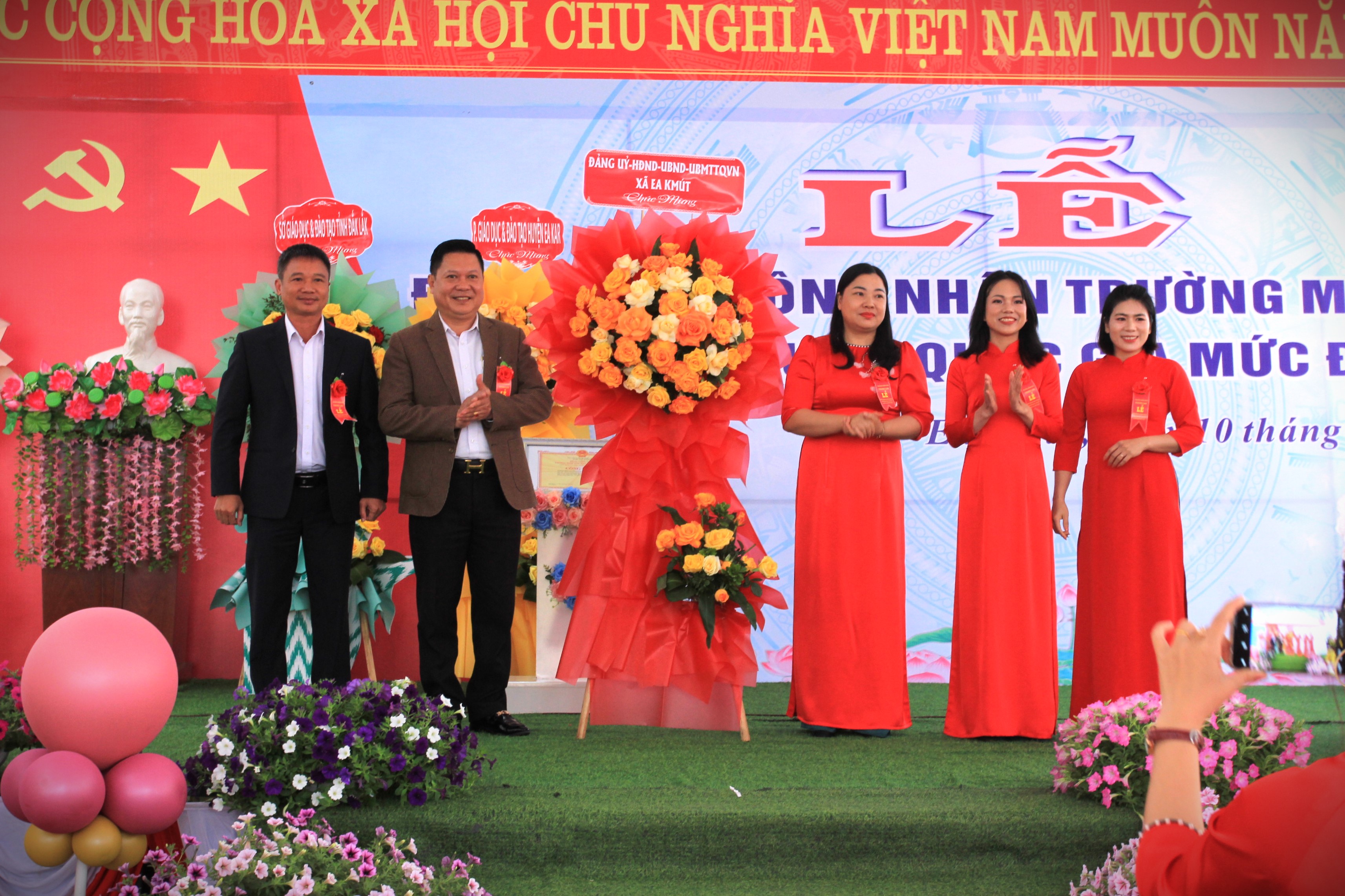 Đại diện lãnh đạo HĐND, UBND, UBMTTQ huyện Ea Kar tặng hoa chúc mừng Nhà trường