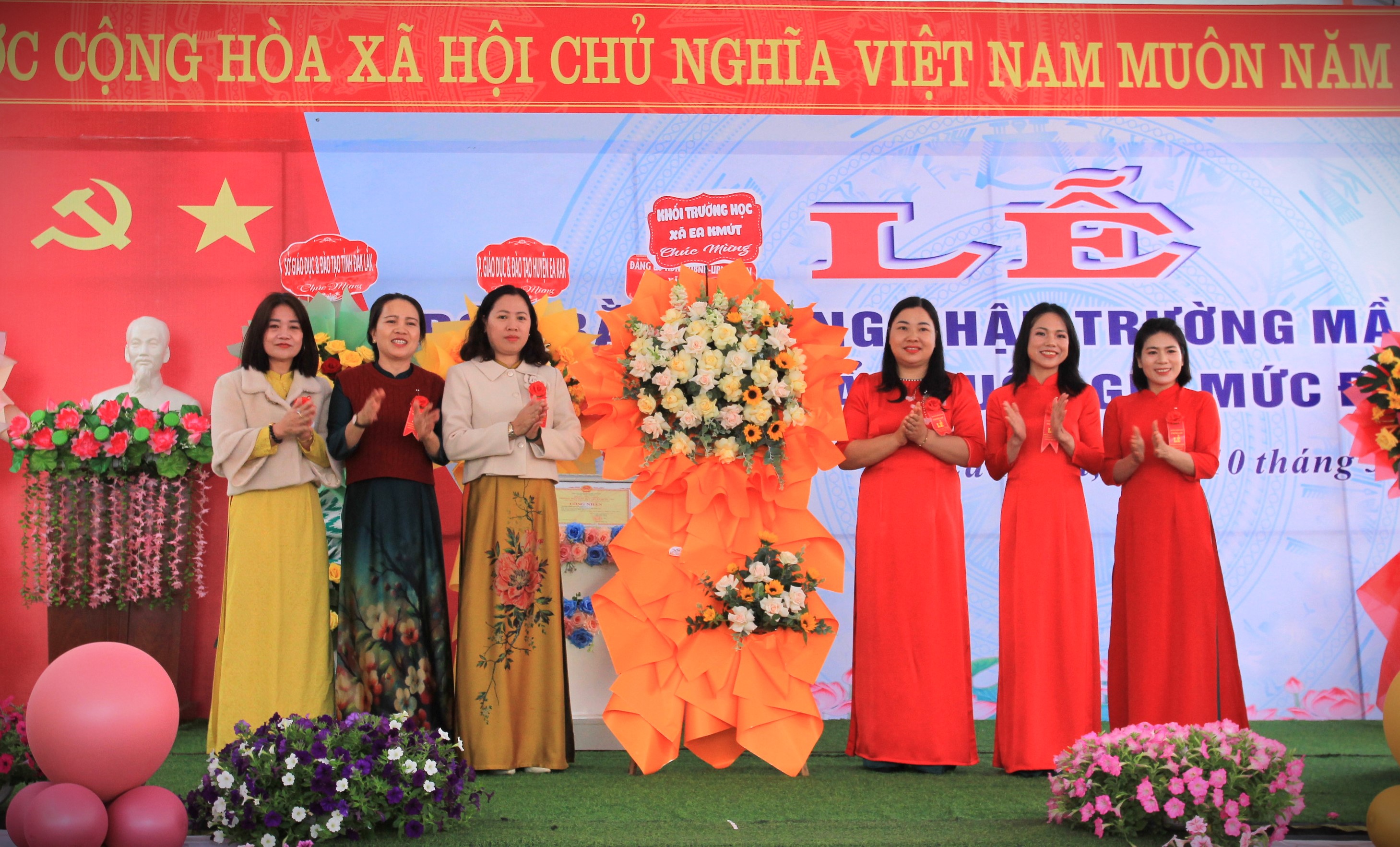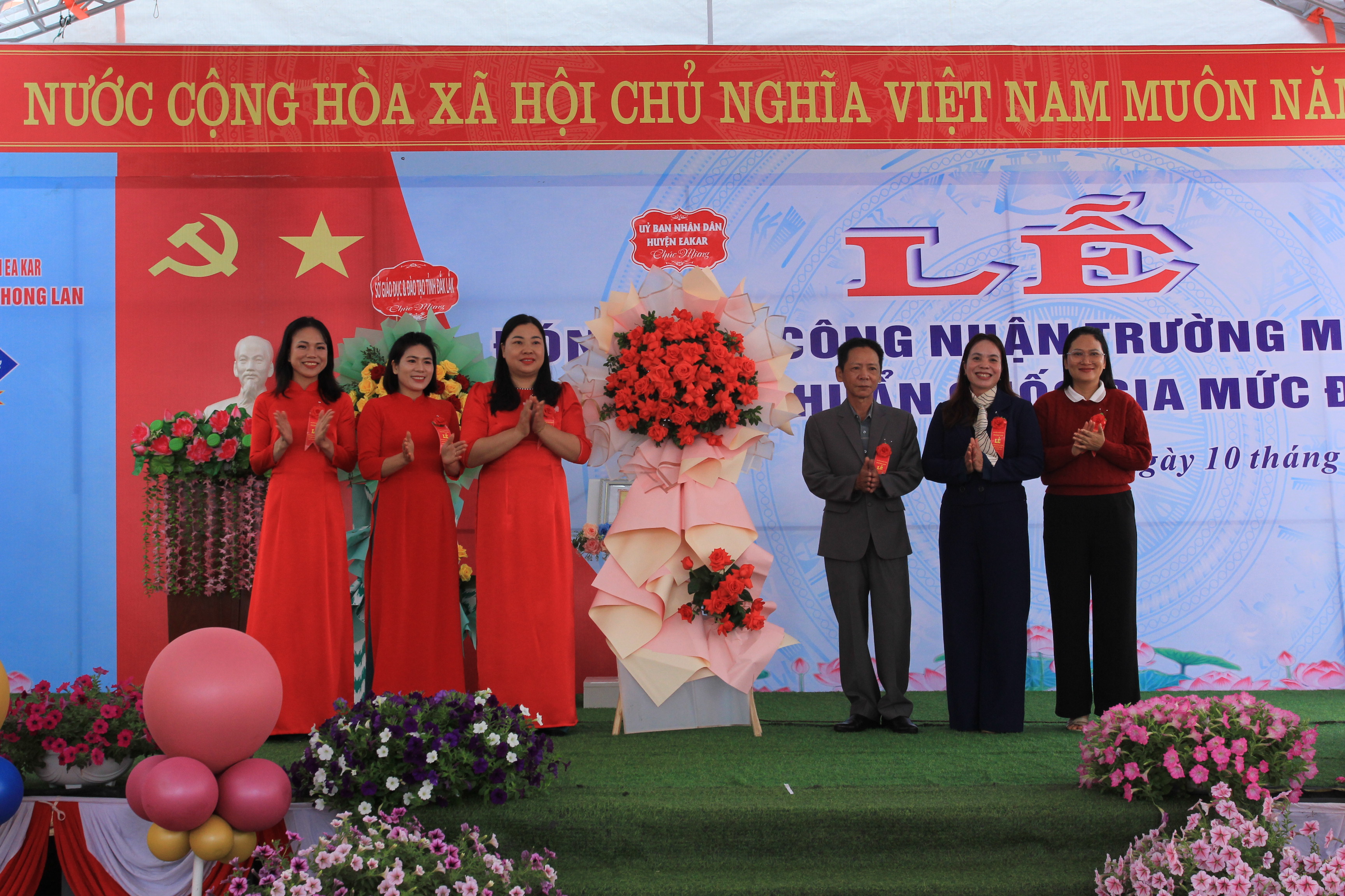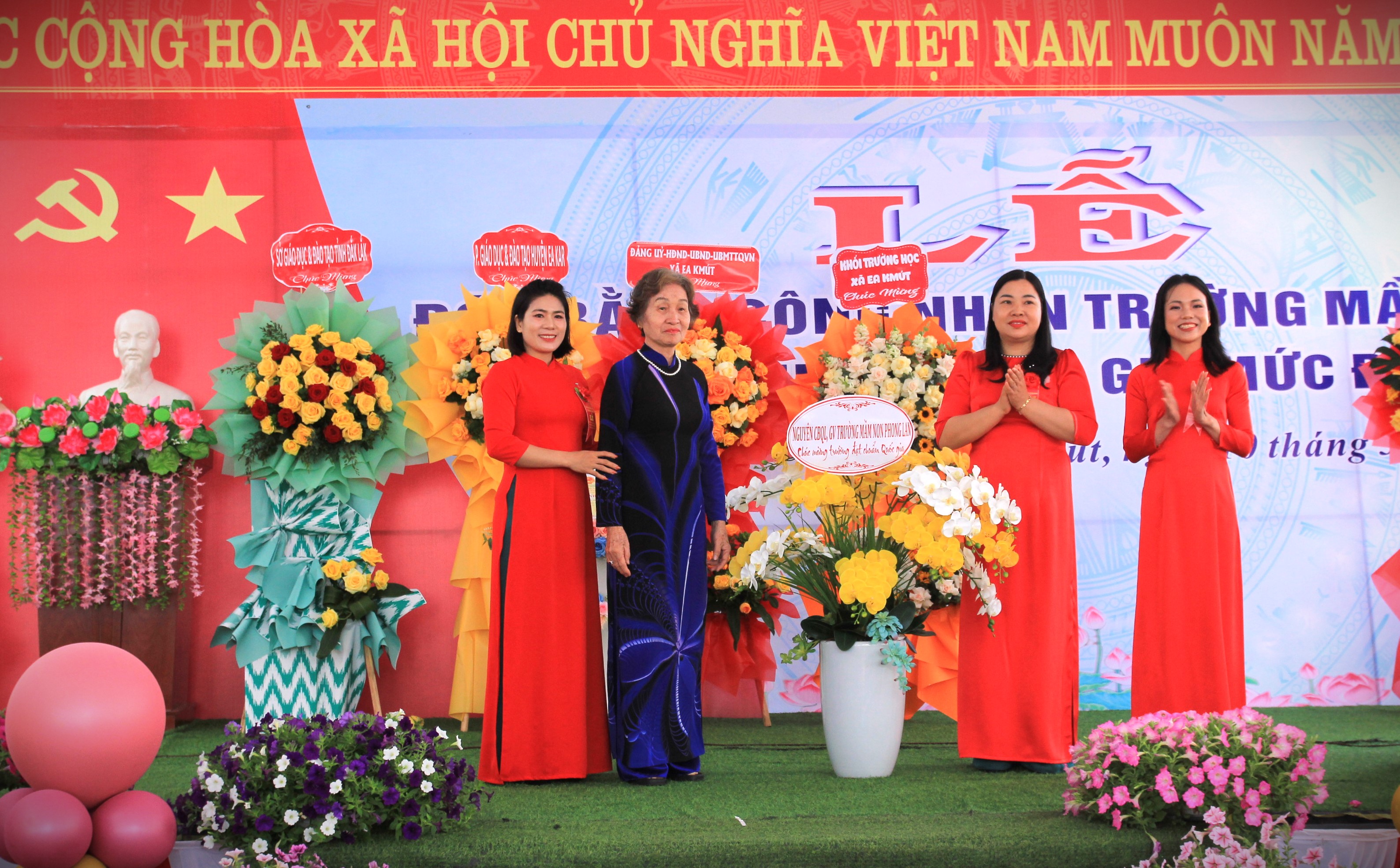 Đại diện lãnh đạo phòng GDĐT huyện Ea Kar tặng hoa chúc mừng Nhà trường