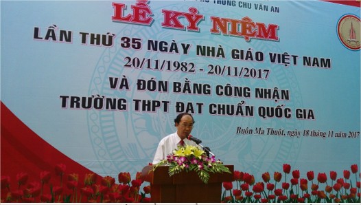 Sáng ngày 18/11/2017, trường THPT Chu Văn An tổ chức kỷ niệm 35 năm ngày Nhà giáo Việt Nam 20/11 và đón nhận danh hiệu trường THPT chuẩn Quốc gia. Dến dự buổi lễ có ông Bùi Hữu Thành Cát – Phó Giám đốc Sở GDĐT, lãnh đạo Thành ủy, HĐND, UBND Thành phố Buôn Ma Thuột cùng các thế hệ cán bộ quản lý, các thầy giáo, cô giáo và hơn 1.600 học sinh toàn trường.